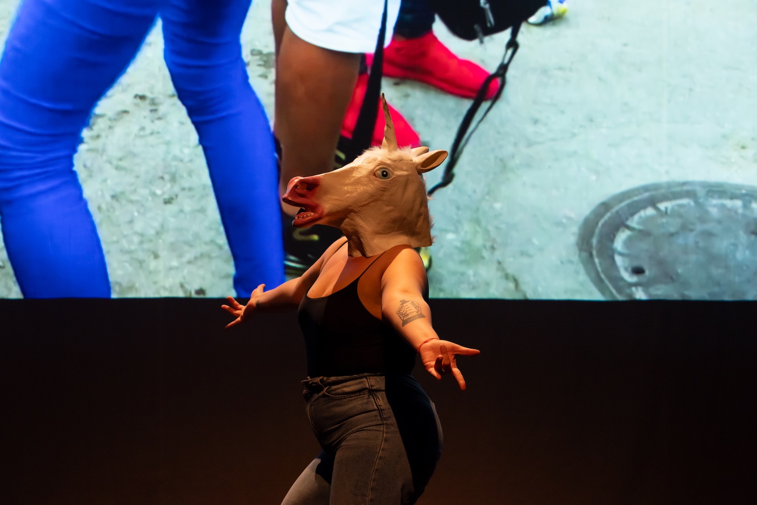 こうした「浮き輪」の象徴性と対比させたとき、パフォーマンス前半に登場した「ユニコーンのマスク」のもうひとつの意味が浮かび上がってくる。マスクとは、「声を封じられる」という拘束性に加えて、「属性」によって 個人の顔 が見えなくなる事態の謂いでもある。「普通ではない」「自然ではない」とされる存在にとって、名を与えられることは、存在の可視化と承認である。だが同時に、「属性」のラベルに個人が矮小化されてしまう危うさもはらむ。だからこそ、「私はユニコーンではない」という反語に、何度でも立ち戻らねばならないのだ。