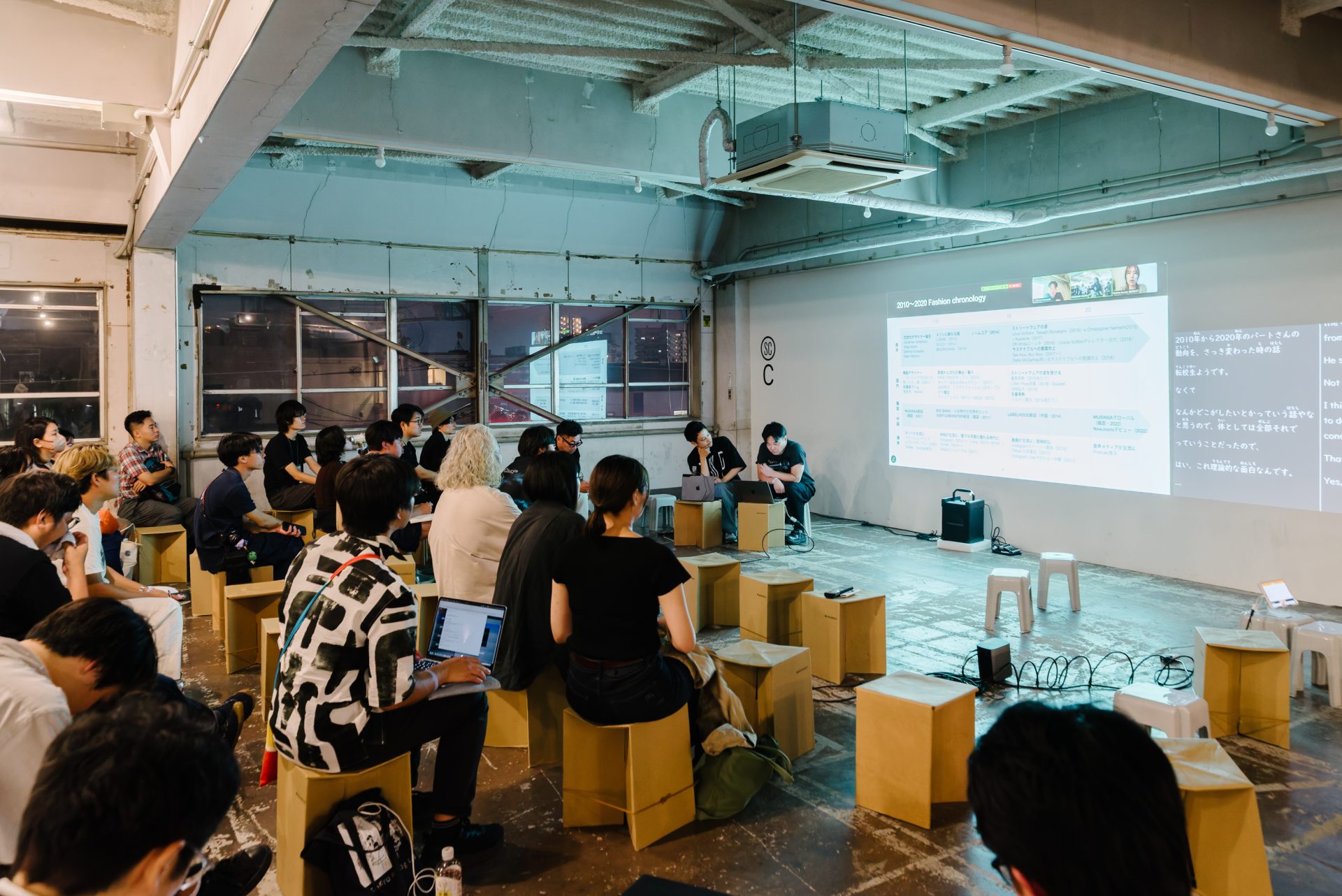 こうした同時多発的な状況が、散漫にならず確かな熱量を帯びて成立しているのはなぜか。その背景には、会場である北加賀屋という土地の文脈と、実行委員たちの制作活動とが──その全員がこの地に拠点を置いているわけではないにせよ──強く結びついているという事実がある。かつて造船の街であったこのエリアは、北加賀屋クリエイティブ・ビレッジ(KCV)として、おおさか創造千島財団による助成や拠点整備が進められてきた場所だ。そして会場近隣の共同スタジオ・コーポ北加賀屋は、実行委員の家成氏らが主宰するdot architectsが運営に携わり、このエリアの物理的な拠点となっている。また、同財団が発行する『paper C』という情報誌/ウェブメディアの制作には、同じく実行委員である原田祐馬氏と多田智美氏が関わっており、長らく大阪のアートとカルチャーを伝え続けてきた。つまりDESIGNEASTは、単に広い会場を借りたイベントというわけではなく、産業遺構を文化的な資産へと転換してきたこの街の蓄積と、そこに深く関与するメンバーの実践とが重なり合うことで、一過性の祝祭を超えた厚みを生み出しているのではないだろうか。