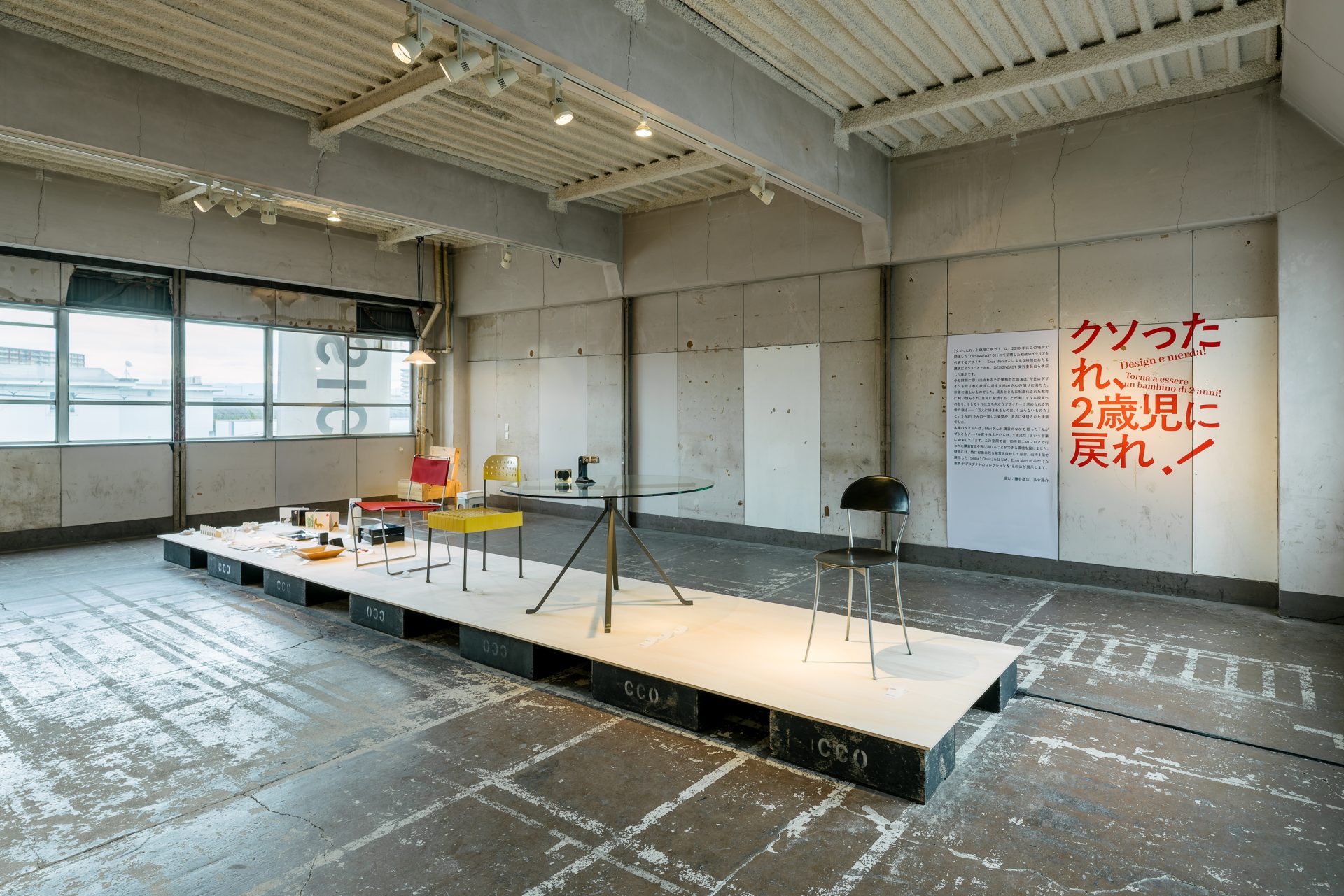 川崎氏が言及しているのは「Mame Kurogouchi: Notes on Fabric」展だが、会場ではもうひとつ、初期の理念を振り返るように、エンツォ・マーリにインスパイアされた「クソったれ、2歳児に戻れ!」と題された展示も設けられていた。この挑発的なタイトルは、マーリが過去の講演で語った「私がぜひともノーベル賞を与えたい人は、2歳児だ」という言葉に由来している。この言葉にかぎらず、家具やプロダクトが展示された展覧会場では、「DESIGNEAST 01」でのマーリの発話の一部がスピーカーを通じて流されていた。