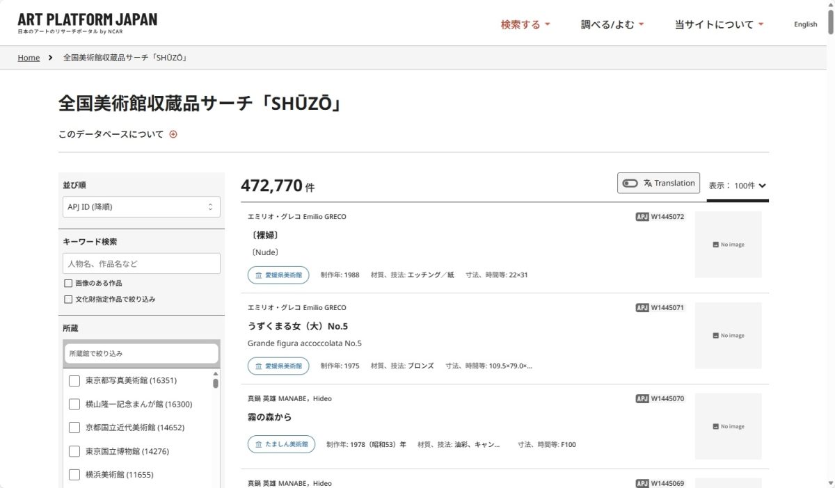 日本の美術館は欧米に比べ小規模で分散しており、「ナショナル・コレクション」としての統合的な発信力が弱いという課題に対応するため、「SHŪZŌ(Japan National Art Collection Search)」は、全国の美術館の所蔵作品の所在情報を日英両言語で横断検索することを可能とした。また、「ジャパンサーチ」(国会図書館運営)とも連携し、日本の美術資産(約6万点以上)のメタデータを、利活用しやすい国際標準形式で整備していくハブ機能も有している。これまで個別の館で死蔵されがちだった作品データが、教育、観光、学術研究等、それぞれの文脈で「つながる」インフラとなった★6。なお、前章で紹介したメディア芸術データベースについても、2023年度よりNCARが「メディア芸術データベースに係る調査研究事業」にて運営している。