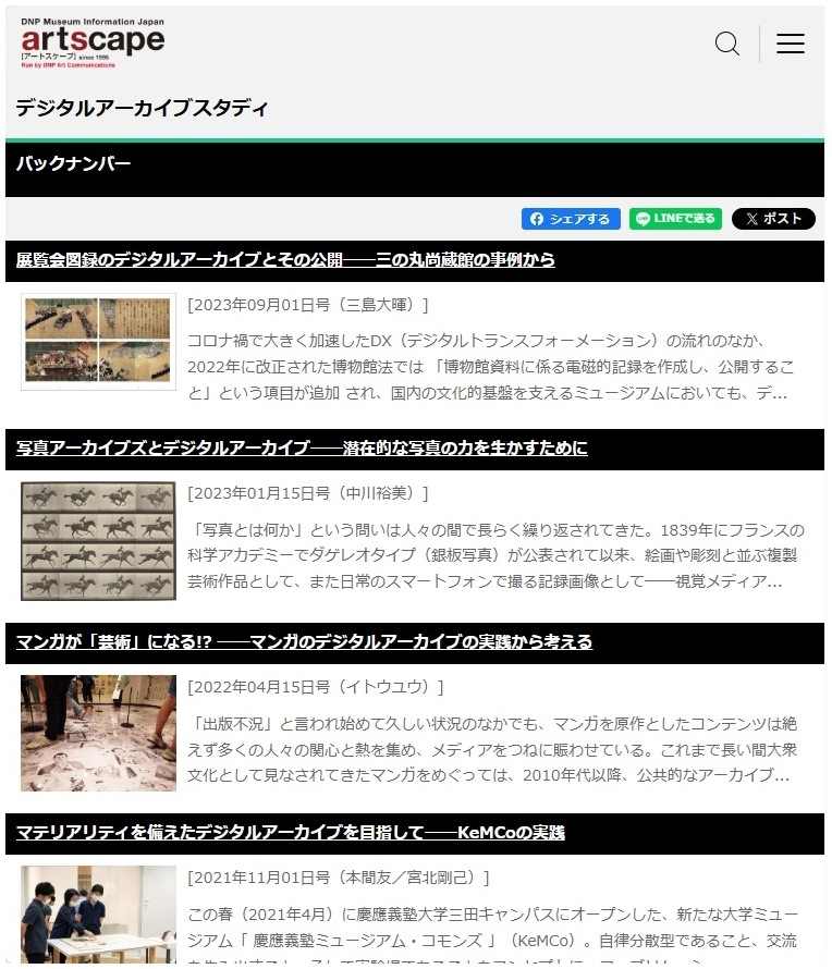 2008年8月15日号からはartscapeで不定期連載として影山幸一による「デジタルアーカイブスタディ」のシリーズの掲載が始まる。第2回にあたる2009年3月15日号でこのMLA連携について触れているが、当時の現状を「特に美術館を含むミュージアムでは図書館に比べ情報化の進展が遅れており、より現場に即した対策が求められている」と指摘している。