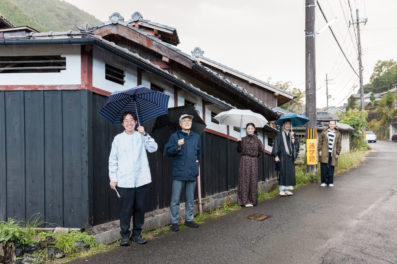 京都・八瀬に残るキリコ塀の前でパシャリ 左から筆者、藤森照信さん、常盤貴子さん、扉野良人さん、鈴木康広さん[撮影:衣笠名津美]