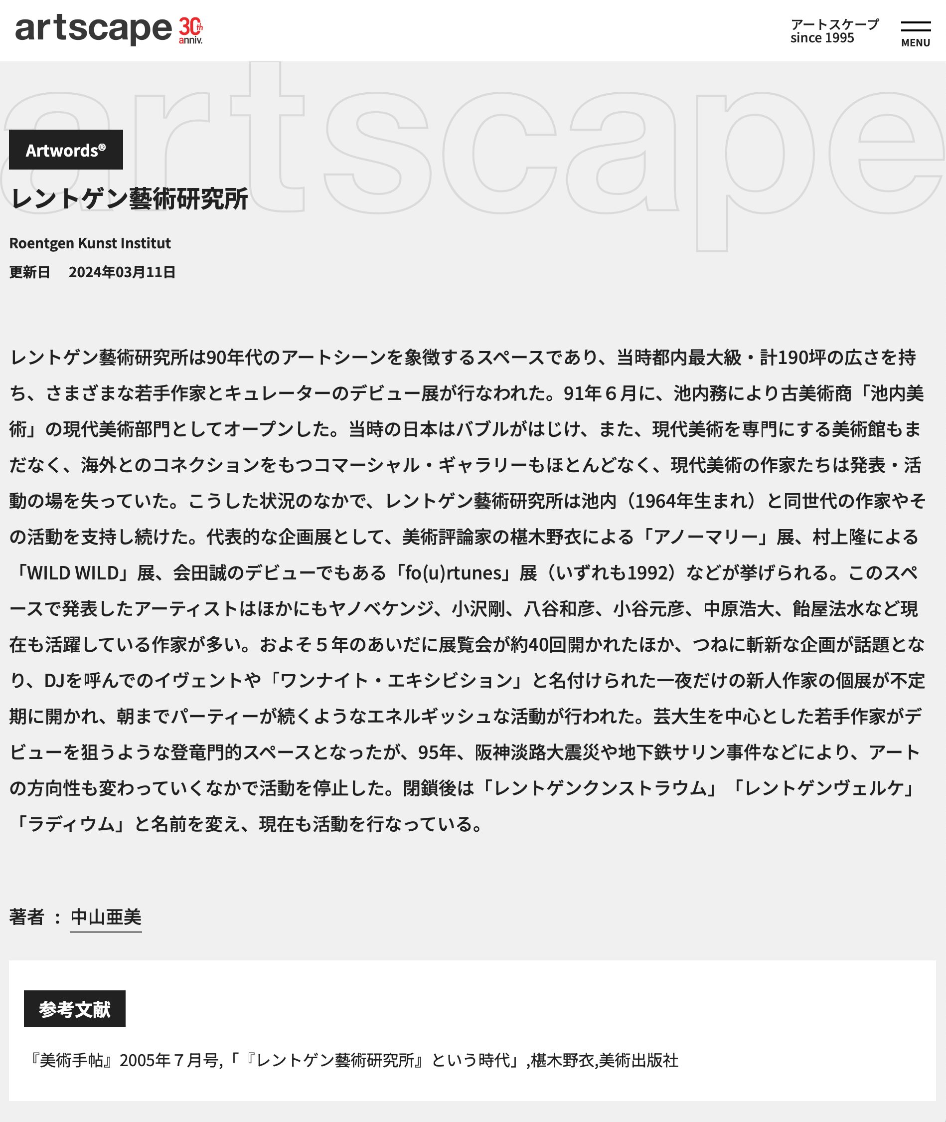 2025年で開設30周年を迎えるartscape。過去に更新されてきた記事のバックナンバーは、その大半がアーカイブされ、現在もオンライン上で読むことができることは実のところあまり知られていません。このサイトに親しんできたさまざまな世代の学芸員や研究者、アーティストたちが、それぞれにとっての思い出の記事や、いまだからこそ注目したい記事を取り上げ、当時の記憶を振り返りながら綴る連載「それぞれのバックナンバー」。最終回となる今回の執筆者は、artscapeとほぼ同い年(1996年生まれ)の現代美術史研究家・鈴木萌夏さんです。博士課程では「レントゲン藝術研究所」を中心とした1990年代の日本の美術シーンを対象にリサーチを行ない、無数の資料を「当時を知らない」立場から見つめてきた鈴木さん。彼女がartscapeのなかの記録や記述にどのように触れ、そして現在の集積をどのように未来に残していくか、近年のご自身の実践のこととともに綴っていただきました。(artscape編集部)