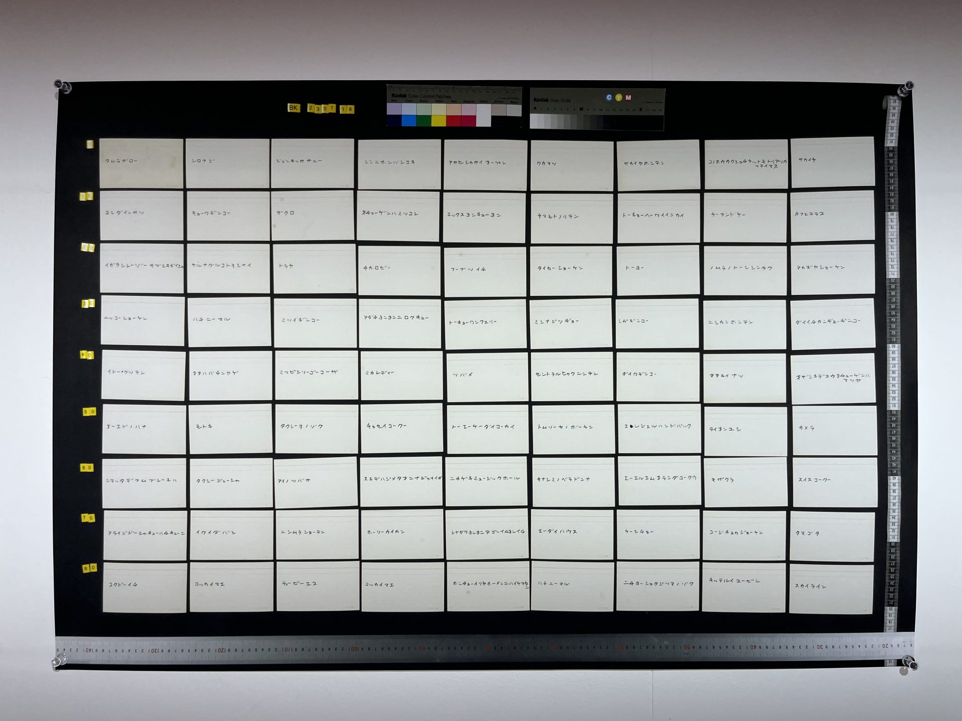 その第二弾にあたる《調書 Vol.2》は1973年7月9日から14日までの6日間において、堀を含む6名の作家が1日につき1名、家から会場へ向かう道中で目にした文字を発声して録音。会場の地図に自らが辿ったルートを赤線で引いたのちに、音声を再生する。その後、8月12日に堀のみが会場へ行き、6名の音声から聞き取った言葉をひとつずつ一枚のカードへ記すという工程を取った★2。2025年における本展はそれらの一連の行為をさらに「調書」として記録するように、4名分の地図と音声を再生し、文字が記されたカード162点をカラーチャートとともに撮影した写真を展覧していた。