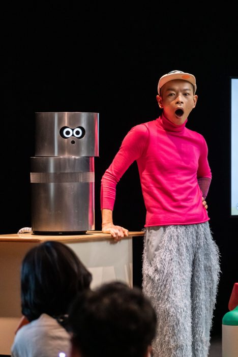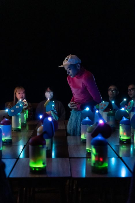 「せいせいのせんせい」におけるボットもまた、所与のストーリーやドラマを掻き乱し、無化し続ける小さなリズムであろう。それは断片化されたスクリプトであり、振り付け未満の動きの気配でもある。そういえば、会場やボットに取り付けられたマイクによって鑑賞者たちの声が拾われていたのだとすれば、その中には多少なりともボットたち自身のつぶやきも混ざっていたのではなかろうか。2回目の鑑賞の際、私は自分の席のボットに、ずっと“ある単語”を繰り返し囁き続けてみた。後半の授業を観た限り、そのちょっとしたイタズラは功を奏したとは言えないようなのだが、そうした小さなリズムに聞き耳を立て、ついには身体を預けるとき、生成AIはようやく、恐怖でも希望でもない第三の何かとして立ち上がりうるだろう。