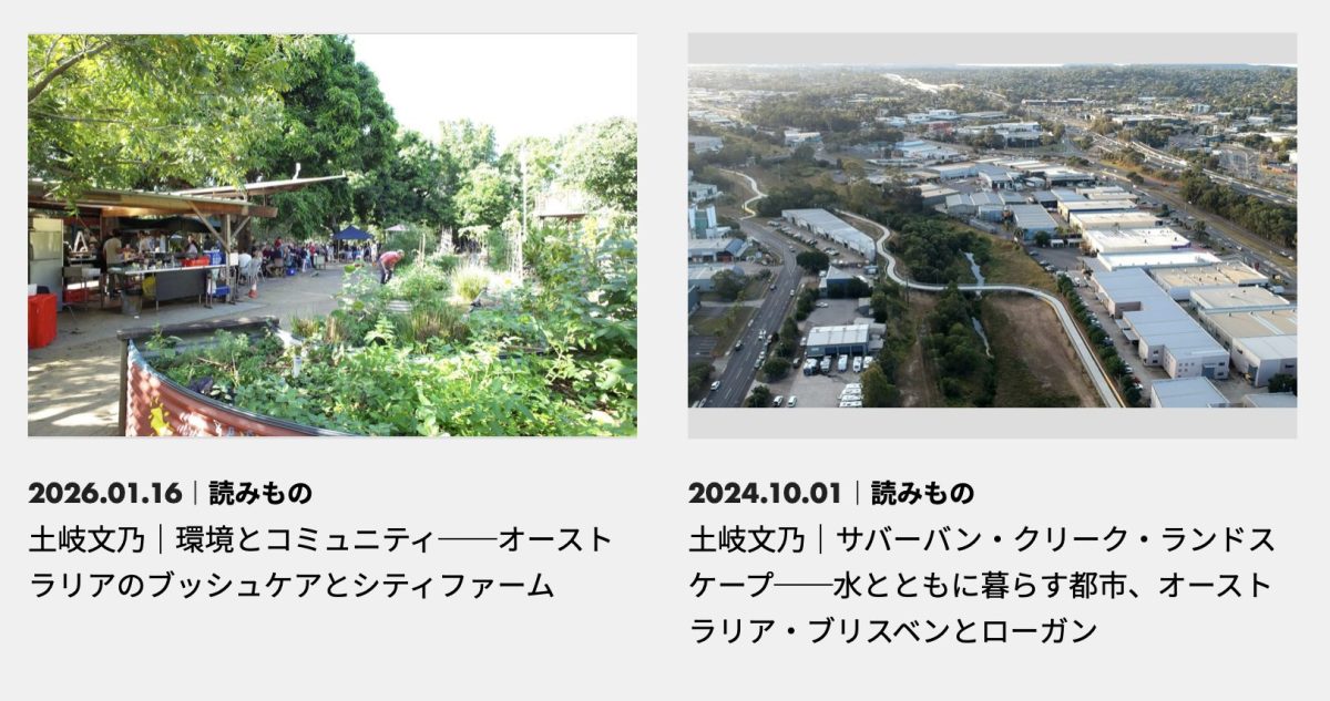 1月16日に、オーストラリアを拠点とする建築家・研究者の土岐文乃さんによる寄稿記事「環境とコミュニティ──オーストラリアのブッシュケアとシティファーム」を公開しました。「【ブリスベン】多文化の波にゆれる都市」(2023年10月掲載)や「サバーバン・クリーク・ランドスケープ──水とともに暮らす都市、オーストラリア・ブリスベンとローガン」(2024年10月掲載)に続く、オーストラリアからの現地レポートとなります。