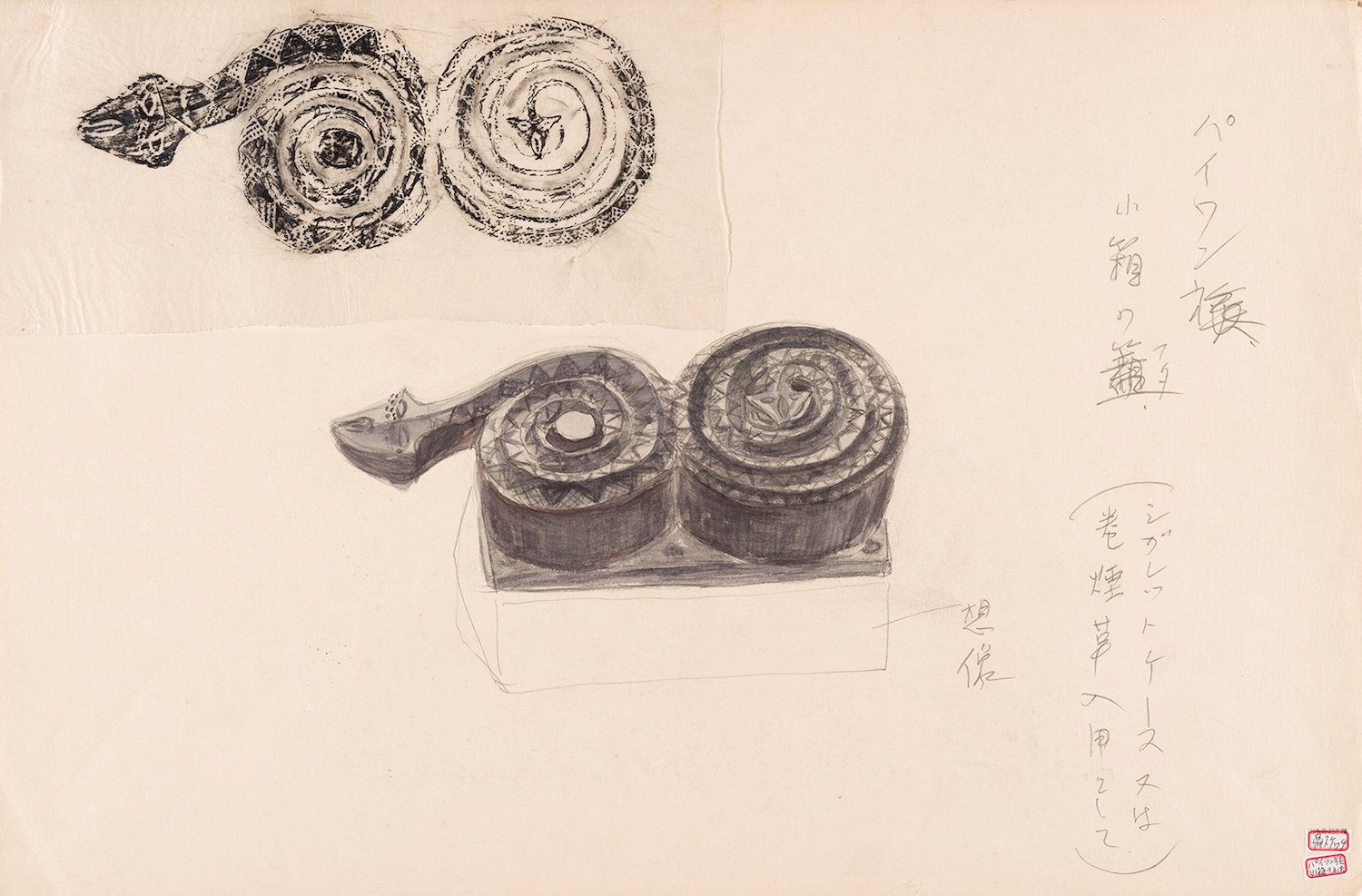 山本鼎《スケッチ パイワン族 小箱の蓋(百歩蛇)》(1924)、上田市立美術館蔵