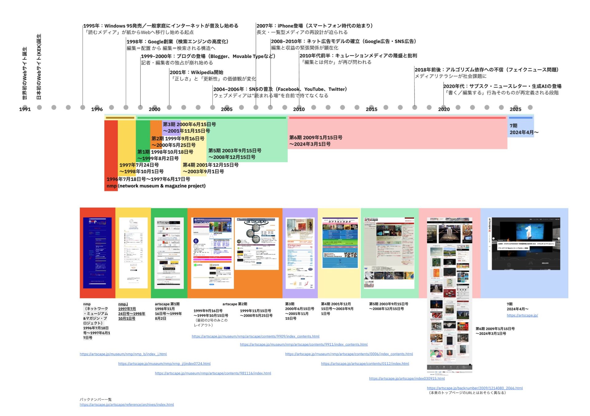 坂本のどか(以下、坂本)──かなり早い取り組みですね。年表 はartscapeのトップページのデザインが切り替わったタイミングを基準に整理しています。「artscape」という名称になる前の時期を、赤と黄色の帯で示しています。