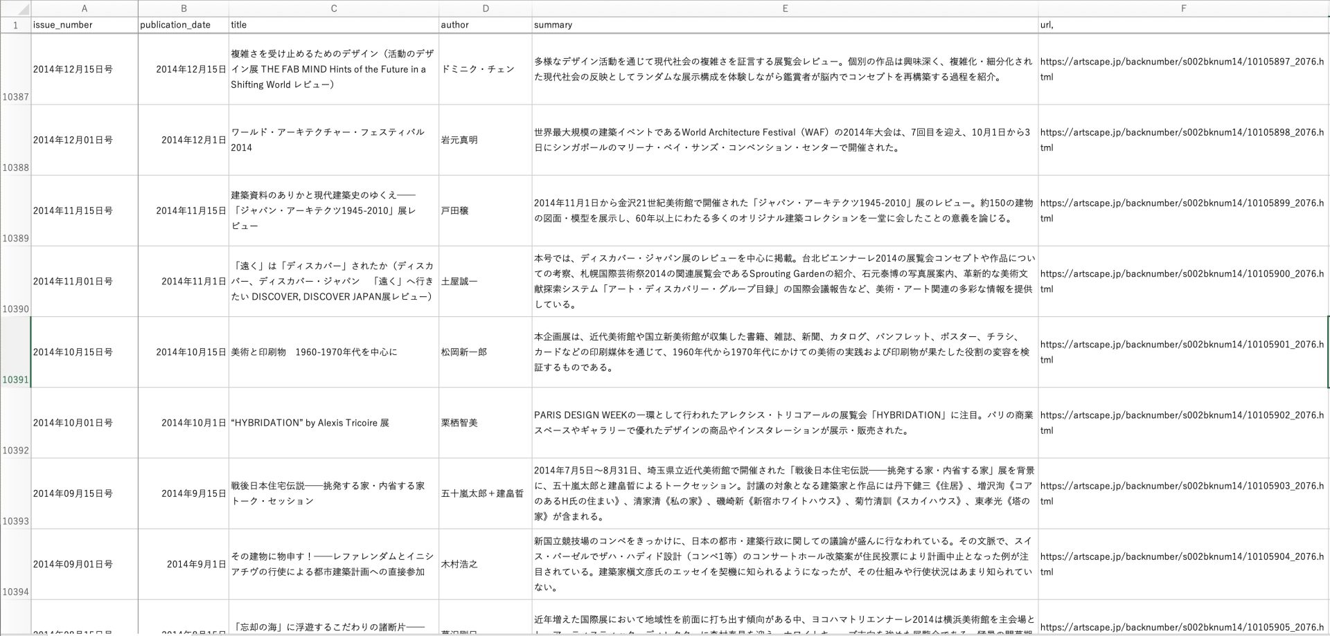 坂本──メタデータ抽出が難しかった理由のひとつに、個々の記事ページにリリース日をはじめとしたメタデータにあたる情報が記載されていない場合があることが挙げられます。また、artscapeというメディアの名称がない場合も。検索して、たまたまそのページが出てきても、いつ誰が書いたどのメディアの記事なのかがわからないようなケースです。