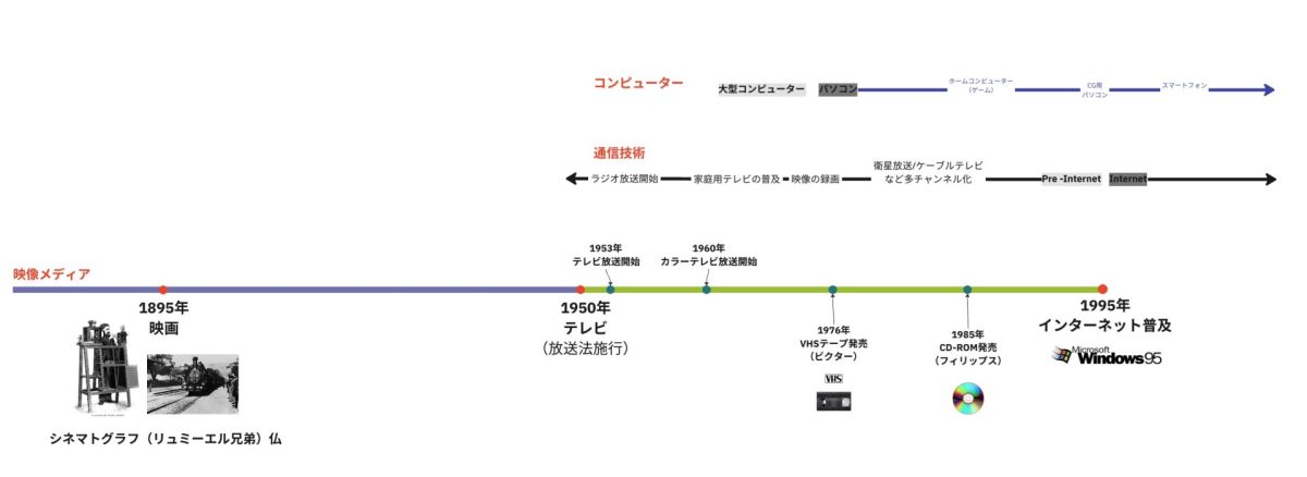 メディア技術の大きな転換点を100年スパンで振り返ると面白いかもしれません。例えば、映画とインターネットの間にテレビがあり、さらに衛星放送などの技術が広がっていくプロセスがあります。
