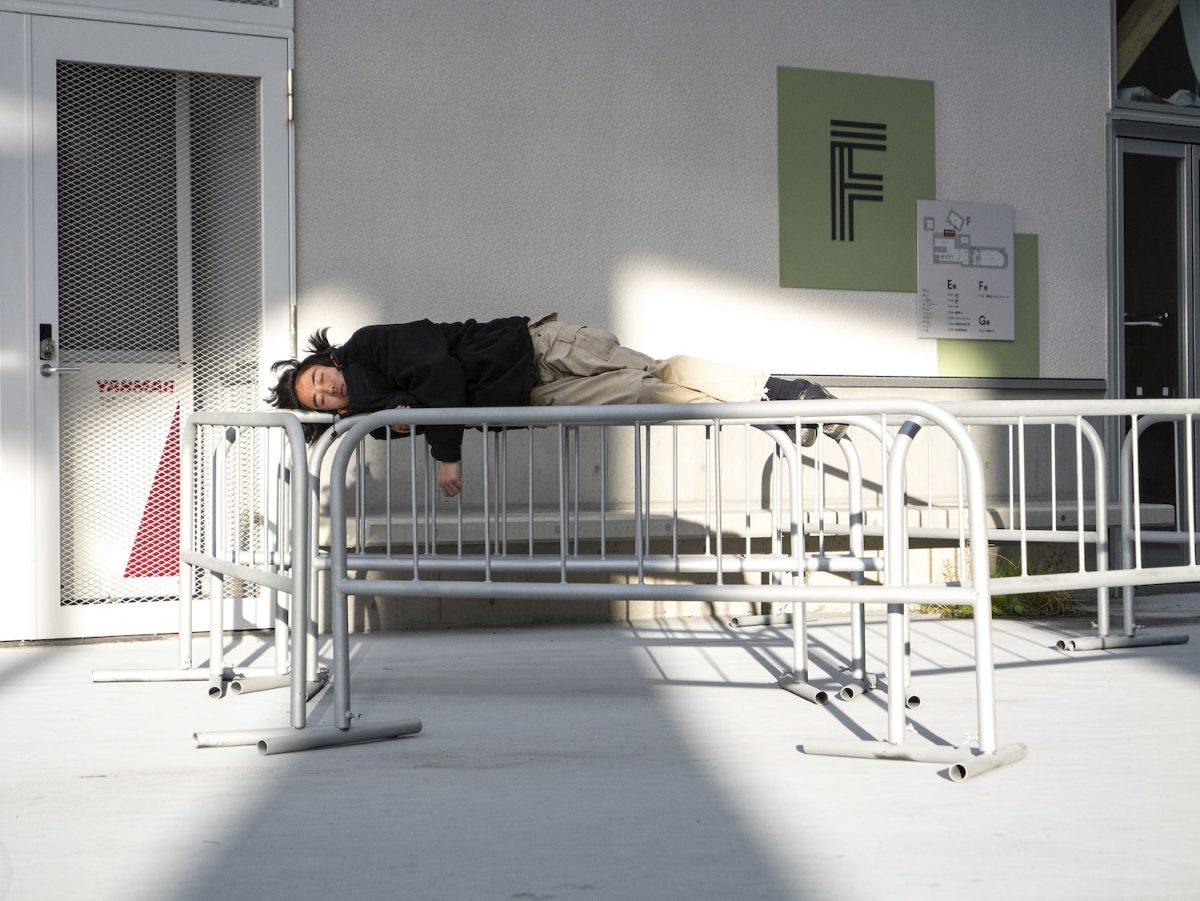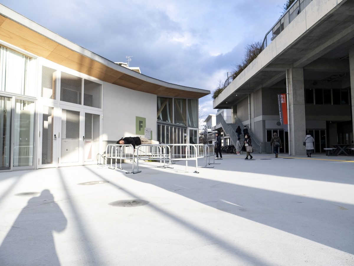 日頃の研鑽の成果をわかりやすい形で提示した作品が多いなかで、まだ発展途中の新しいキャンパスで日々発見する少しの違和感を起点とし、学生としての現在の自分にとって、大学という「場」がいかなるものであったのかを、ものを作ることを通して地道で実直に捉え直そうとする本作品は、わたしの目にはとても好ましく映った。寒空の下、冷たい風に吹かれながらも動じずに、自ら制作した造作物の上で眠り続けるさまは、迷える学生時代を終え、未来へと一歩足を踏み出すための瞑想を行なっているかのようで、見ているこちらまで清々しく晴々とした気持ちにさせてくれる。清田は学部時代から大きな構造物とそれに付随する行為に着目した作品を手掛けている★1のだが、これまで見てきたなかで最も解像度が高く、かつさまざまな示唆に富んでおり、大学院市長賞(専攻内の大学院生の作品で最も優秀なものに贈られる賞)に相応しい秀作であった。