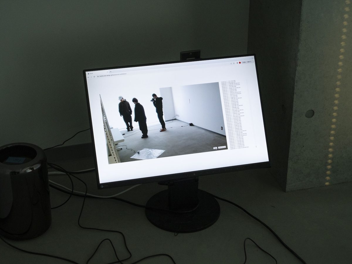 この画面はインターネット上で公開されており、リアルタイムに部屋の中の様子を映し出している。この部屋のなかで、あるいはオンラインで、「Hello」と誰かがクリックすると、床に配置されたビニール袋が微かに膨らみ、それが「How are you」の場合は壁に貼られたテープがわずかに揺れる。かつて、この部屋にいた誰かの気配であると同時に、この場にはいない誰かとの、目に見えないつながりのしるしであるかのように。