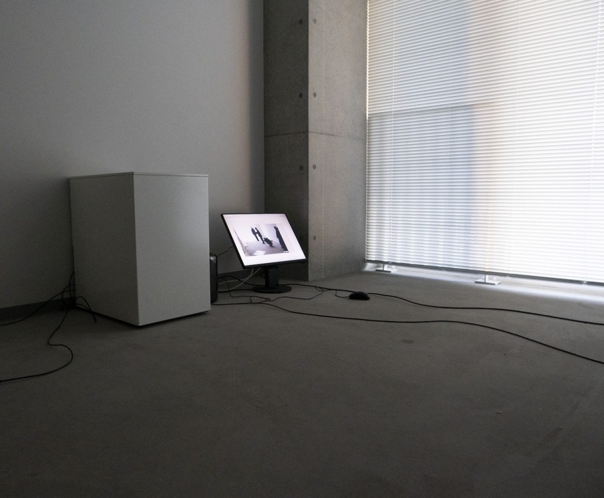 教員の個人研究室がずらりと並ぶ廊下(つまり、そのほかの展示会場からは少し離れた場所)に、ひとつだけドアの開いた部屋がある。好田が展示場所として選んだのは、現在は使用者不在の一室だ。空っぽの本棚、何も置かれていない机、キャビネットという最低限の研究室備品が隅に置かれ、ブラインドが降ろされた南向きの窓はやわらかく光っている。窓の向こう側に面したJRの線路からは、断続的に電車が走る音が聞こえる。それだけでこの部屋はとても美しい、と語る好田がこの部屋に設置したのは、デスクトップPCとモニター、二つの小さな装置、そして小型のウェブカメラのみだ。モニターの画面にはブラウザが映し出されており、そのなかにはウェブカメラが捉えた部屋のなかの映像と、何らかのアクセスログ、そして「Hello」と「How are you」の小さな二つのボタンが見える。