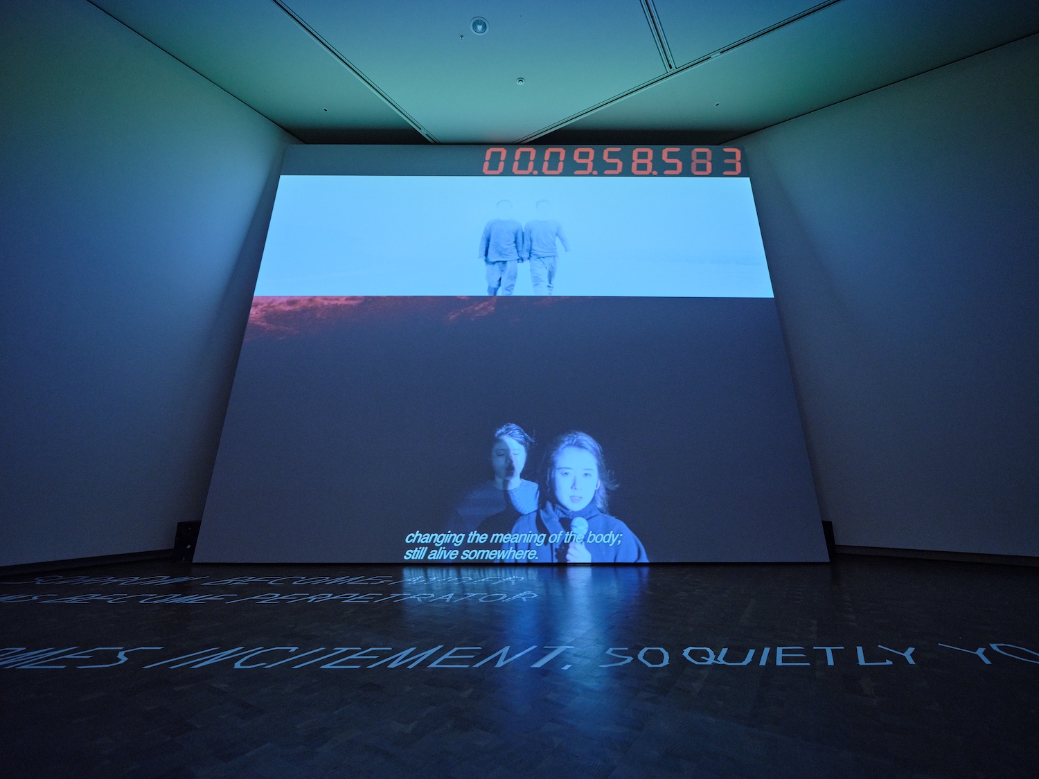 そして、国家や権力によって敷かれた閉塞的な通路を、「抵抗の歩みを進めていくための道」へと読み替える行為によって交差するのが、志賀理江子の映像インスタレーション《風の吹くとき》と飯山由貴の映像作品《In-Mates》である。志賀の《風の吹くとき》は、スクリーンが上下に二分割され、下部では、東日本大震災後に造成された長大な防潮堤の上を、暗闇のなか、若い女性がレポーターのように語りながら淡々と歩を進めていく。語られるのは、中央に対して「東北」と名付けられた地域が、食糧や労働力、エネルギーの供給地として搾取されてきた歴史について、そして震災後の復興事業における「惨事便乗型資本主義」の形で再び搾取が反復される構造だ。語りかける女性の後ろには、もう一人、目を閉じた女性が影のように付き従い、震災の死者や沈黙を余儀なくされた人々の存在を示唆する。上部の映像では、同じく夜間や昼間に防潮堤の上を歩く人、ブルーシートで覆われた地面、重機、赤く着色された水流などイメージの奔流がフラッシュバックのように畳みかける。女性の語りは二度繰り返され、搾取の歴史の反復性を示すが、映像の上部で赤く点灯するデジタル数字のカウンターは次第にぼやけて視認できなくなり、震災の記憶の忘却を示唆する。