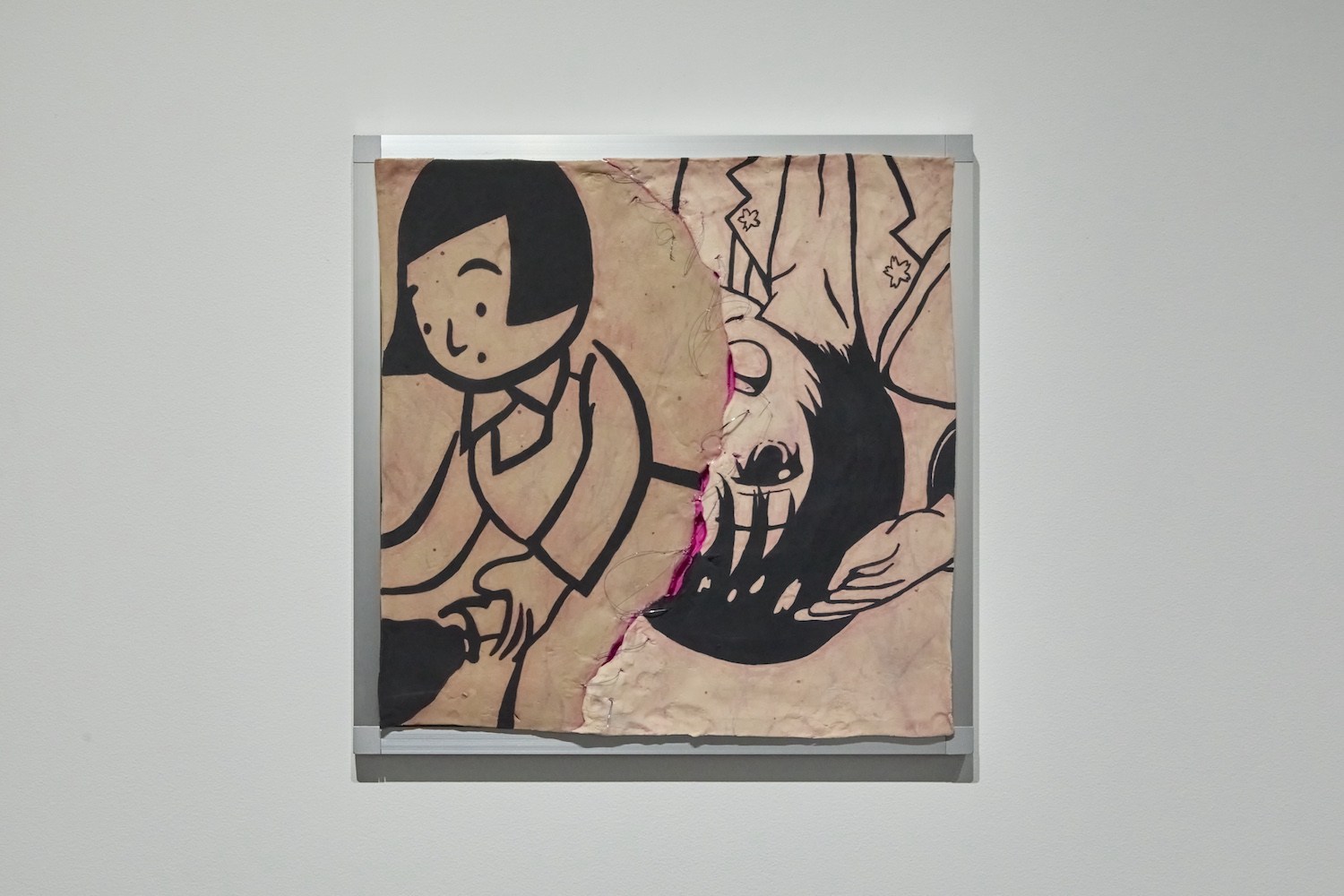 同様に、戦前と現代における少女のキャラクター表象の引用を通じて、そこに投影された男性の眼差しに言及するのが、小宮りさ麻吏奈の《Operation: 1941/2026》である。タイトルの年代が暗示するように、画面左側には戦前の翼賛プロパガンダマンガの引用が、右側には、素肌に軍服をまとって敬礼のポーズを取る「萌えミリ」の少女キャラクターが配されている。「萌えミリ」とは、萌え(美少女)と、戦艦や戦車などの兵器やミリタリー要素を掛け合わせたジャンルである(『艦隊これくしょん』『ガールズ&パンツァー』などが代表例)。左側の翼賛マンガからの引用では、おかっぱ頭の少女が手淫しているように見える(断片化されているが、実際には赤ん坊の手を引いているカットである)。ヘテロ男性にとっての性的対象として、あるいは「家庭内のケア労働の担い手」として表象されてきた少女像を、小宮は人造皮膚を思わせる支持体に描画し、ワイヤーのような糸で縫合する。それは、二次元のイメージに擬似的な身体を与え直す行為であると同時に、時代を超えた眼差しの連続性と暴力性を、「継ぎはぎされた傷だらけの身体」として文字通り提示する。