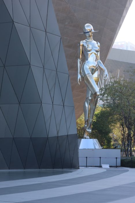 《MOCAPE》の前に設置された空山基の特大ロボット[著者撮影]