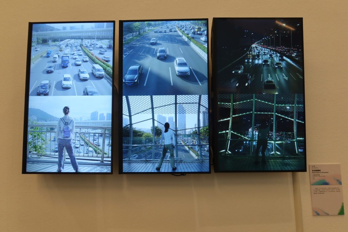 またアーティストは大御所から若手まで、多世代にわたり、さまざまなメディウムを使う作品が展示されていた。《深圳美術館》は都市を観察すること、都市の記憶を保存すること、都市の革新の触媒となることが求められており、この展覧会では、深南大道の歴史的な意義を振り返りながら、都市の精神を美的に解釈することを目指したという。会場構成のデザインもストリートを意識し、床に道路のラインや横断歩道の線を引き、カーブミラーを立て(来場者のセルフィー撮影に使える)、十字路をつくり、4つのセクションが振り分けられた。