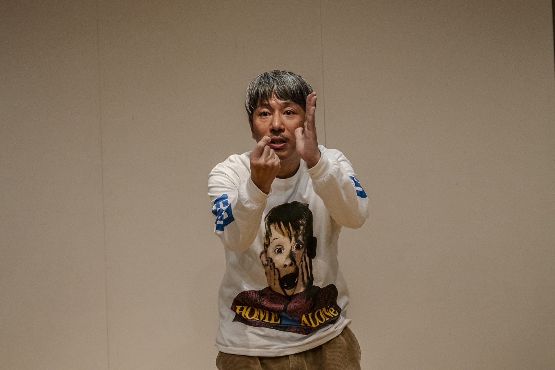 さて、30分弱のパフォーマンスが終わり、袖へと下がった桑折はしかしすぐさま再び登場し、なんと「2周目」を上演しはじめる。「1周目」と違うのは、その2周目が先ほどのパフォーマンスを録音した音声に合わせて行なわれる点だ。まさにタイトルにある通りの「カラオケ」である。だが、桑折の口から発せられるのは1周目と同じテキストではない。2周目の桑折は、身体は1周目をなぞりながら、口では1周目のパフォーマンスにセルフコメンタリーを付けていくのだ。