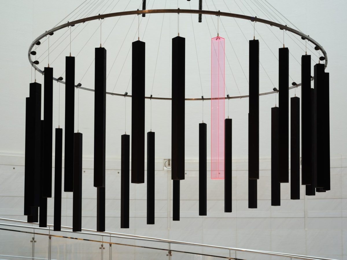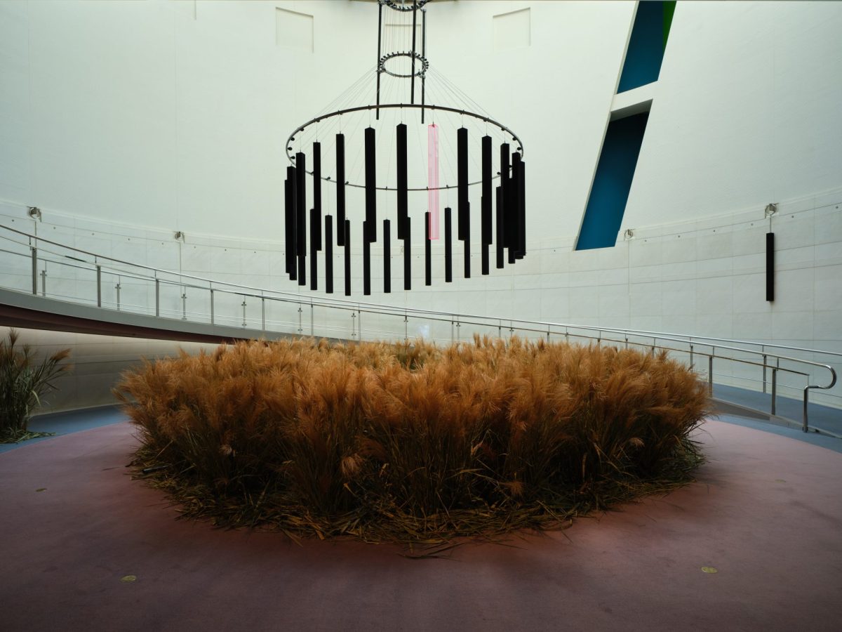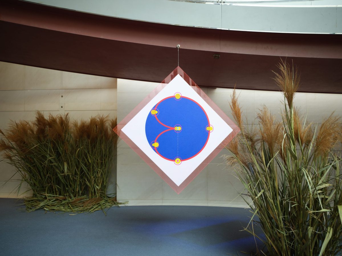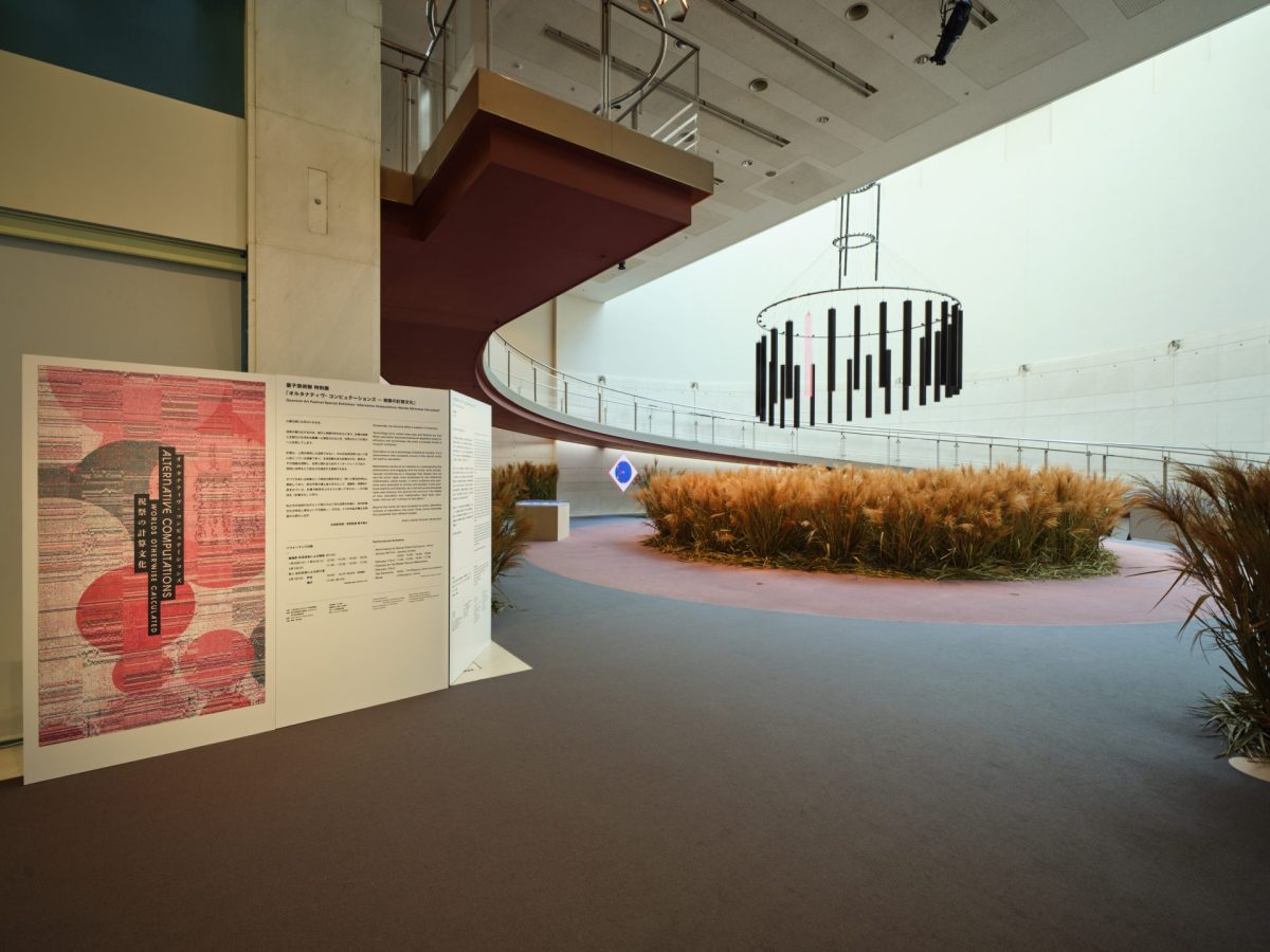 スパイラルガーデンの螺旋状の吹き抜け空間を満たすように葦の原が広がり、中央には四畳半の畳が敷かれている。その上部には黒く細長い直方体が複数個、円を描くように吊り下げられ、ゆらめいている。空間を包むのは幽かなアンビエントであり、それは雨音や大気のうねり、虫の声などを想起させながら天上へと消えていく。展示と同名のタイトルを冠した新作大型インスタレーション《オルタナティヴ・コンピューテーションズ》だ。その脇には、算額(問題の回答を絵馬にして神社に奉納するという、和算の文化的側面を象徴する慣習)に着想を得た《ファントム・リアリティーズ(幽玄的実在)》と、使用する集約ルール(計算手法)の違いによって、同じ投票結果から異なる民意が導出されるさまを可視化した《ニュー・ルソー・マシーン》が並んでいる。