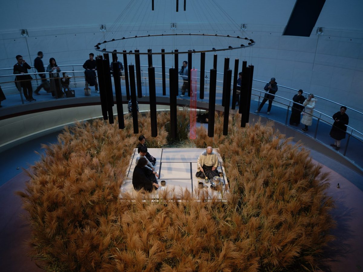 この複数の宇宙の間を往還するものが、振動=音であり、会場を包むアンビエントである。青木によればこれは、上方に設置されたカメラが捉えた人の動きを入力として量子リザバーコンピューティングによって生成されたものであるらしく★6 、まさに溜池に立つ水飛沫を想起させるような雨音が空間に響き渡っている。また、畳の上では定期的にパフォーマンス——舞踊家・苳英里香による舞と、茶人・松村宗亮による茶の湯——が執り行われており、それぞれの所作もまた、上部のカメラを介してリザバーへと入力され、空間のサウンドスケープや算木の挙動に影響を与えているという。現状の量子コンピューティングにおける課題のひとつが、正確な計算のためのノイズ対策であるが、量子リザバーコンピューティングではこのノイズ自体が、量子系のダイナミクスとして計算資源へ転換される。すなわちここでは、比較的近い未来において実装されるであろう「ノイズを排除した量子コンピュータ」を相対化するためのオルタナティヴとして、「ノイズと共生する量子コンピュータ」の原型が示されているわけだ。