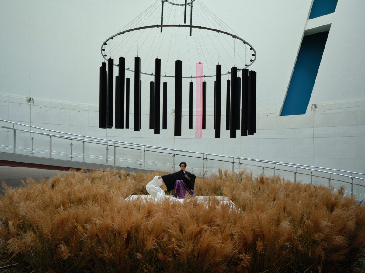 本展の中心的作品である《オルタナティヴ・コンピューテーションズ》に焦点を当てつつ、より詳しく見ていこう。空中に吊られた28本の直方体は、和算で用いられる計算道具である算木を象徴し、中国の天文概念である二十八宿に対応しているという。二十八宿は、約28日周期で天球を運行する月に1日ごとに星座を対応づけたものであり、本作では東アジア的なコスモロジーを代表している。その下に広がる葦の原は『古事記』で描かれる葦原中国=人間世界を彷彿させ、中心に並べられた四畳半の畳は、小宇宙としての茶室を立ち上げるための基本的な空間構成である。あるいは、四畳半とほぼ同一の広さを持つ方丈のことを思い出すならば、これは鴨長明が隠棲した草庵にも結びつくだろう。いずれにせよ、本作の中には、天・地・人それぞれのスケールにおける宇宙の解釈が入れ子状に存在しており、それらは各々のリズムにおいて生々流転を繰り返している。天体が空を巡り、葦が風にさざめき、人が畳を踏む。