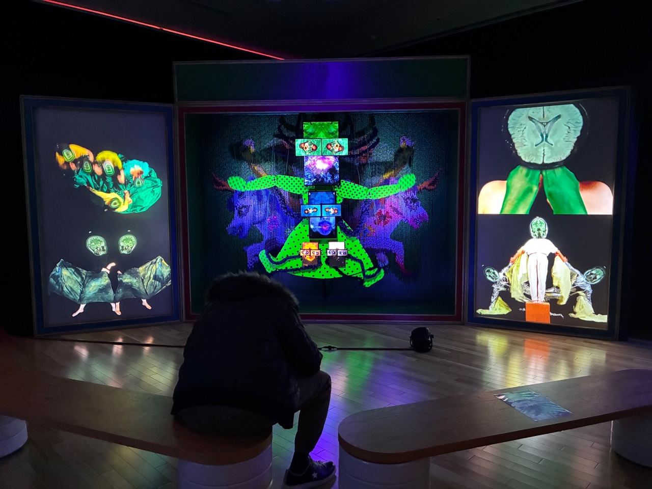 作品は1点ずつ区画が分かれており、その間の通路は照明が落とされ紫色っぽい緞帳に覆われて、昭和のキャバレー(行ったことないけど)を彷彿させる艶かしさだ。ふと思ったが、《アニマーレ》(2024-2025)のように電飾やネオンに囲まれたアイコン(イコン)は祭壇画を思い出させるし、《プラナリア》(2020-2021)や《ポロニア》(2025)に見られる3面スクリーンはまるでトリプティク(三連祭壇画)である。これは現代のバロック芸術ではないか。すっかり洗脳されて出てきた。