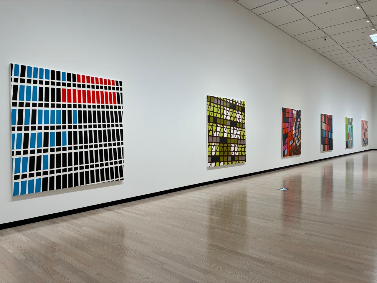 作品はアルファベットや数字などの記号、モダン建築の織りなすパースがかったグリッド、音声を計量化したグラフなど、現代社会を取り巻くさまざまな情報やパターンをカラフルな抽象絵画に昇華させたもの。目を見張るのはその完成度で、笹岡由梨子とは違って手の痕跡を感じさせない絵画は、芸術品というよりもはや工業製品である。これがアートマーケットに乗るための条件なのか。