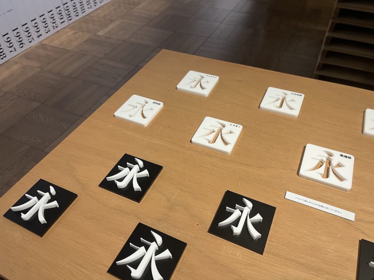 しかし本展はそんな生半可な愛着ではなく、明朝体へのもっと深い愛が感じられる内容であった。まず、ヒラギノ明朝やリュウミン、本明朝など、現代の主要な明朝体の紹介があり、その字体や特徴の他、原図や実際に使用された印刷物などが併せて展示されていた。そもそも明朝体のエレメント(各要素)に、さまざまな名前が付いていることもよく把握していなかった。「ハライ」や「テン」「ハネ」などは想像がつくが、「横棒」の右端に付く三角の部分(毛筆でいえば止めの部分)を「ウロコ」というなど、独特の名前もある。全体のバランス感やそうしたディテールに目を凝らしながら一つひとつの字体を眺めていると、さまざまな違いがぼんやりとではあるけれど見えてくる。ユニークだったのは、展示の導入部でこれらの書体がパズルになっていたことだ。オス型とメス型のピースが合致するとすっぽりとハマる仕組みで、私も実際に触って楽しく遊んでみたが、しかし書体名を見てその字体をすべて当てられる人なんて、プロのグラフィックデザイナーのなかでもごく一握りになるのではないか。