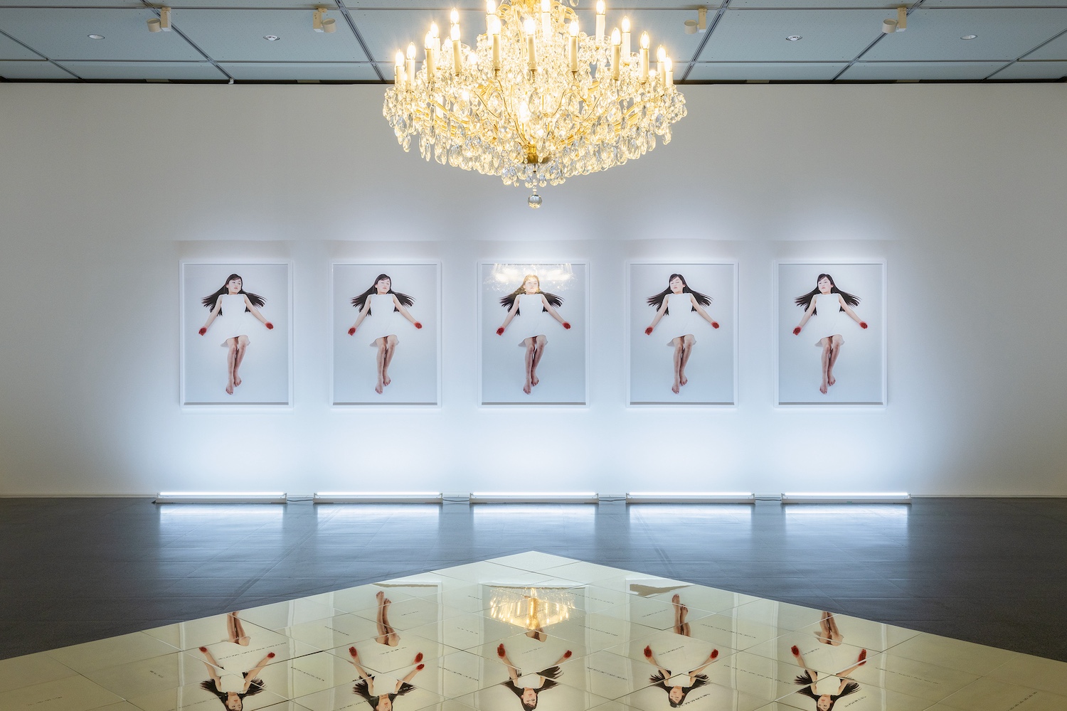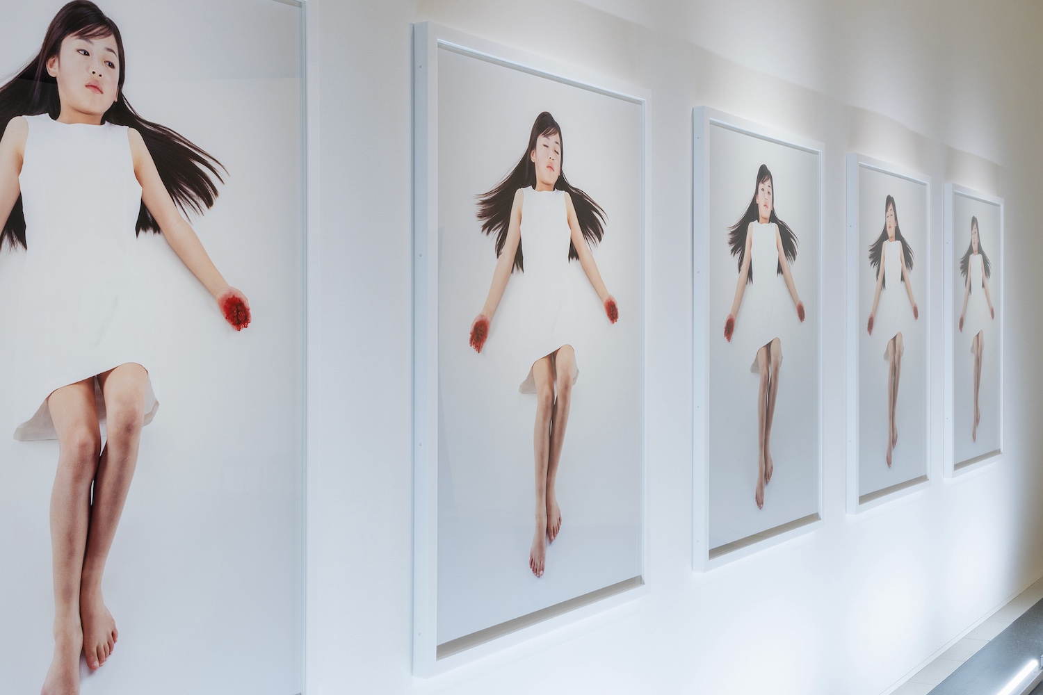 本稿では、特に、展示前半の視覚的なハイライトと言える、小谷元彦の《Phantom-Limb》と石原友明の《世界。》が配された展示室への着目から出発する。小谷の《Phantom-Limb》は、白いワンピースを着たロングヘアの少女が、キリストの磔刑像を思わせるポーズで、重力から解放されたかのように白い空間に横たわる、5点組の写真作品である。まどろむような表情とは裏腹に、少女の腕の先は真っ赤に染まり、一見、手首が切り落とされたかのような衝撃を与える。近づくと、鮮血に見えたものは、掌で握り潰したベリーであることがわかる。タイトルの「ファントム・リム(幻影肢)」とは、事故や病気で失った手足が実在するかのように感じたり、無いはずの手足の痛みを感じる現象を指す。