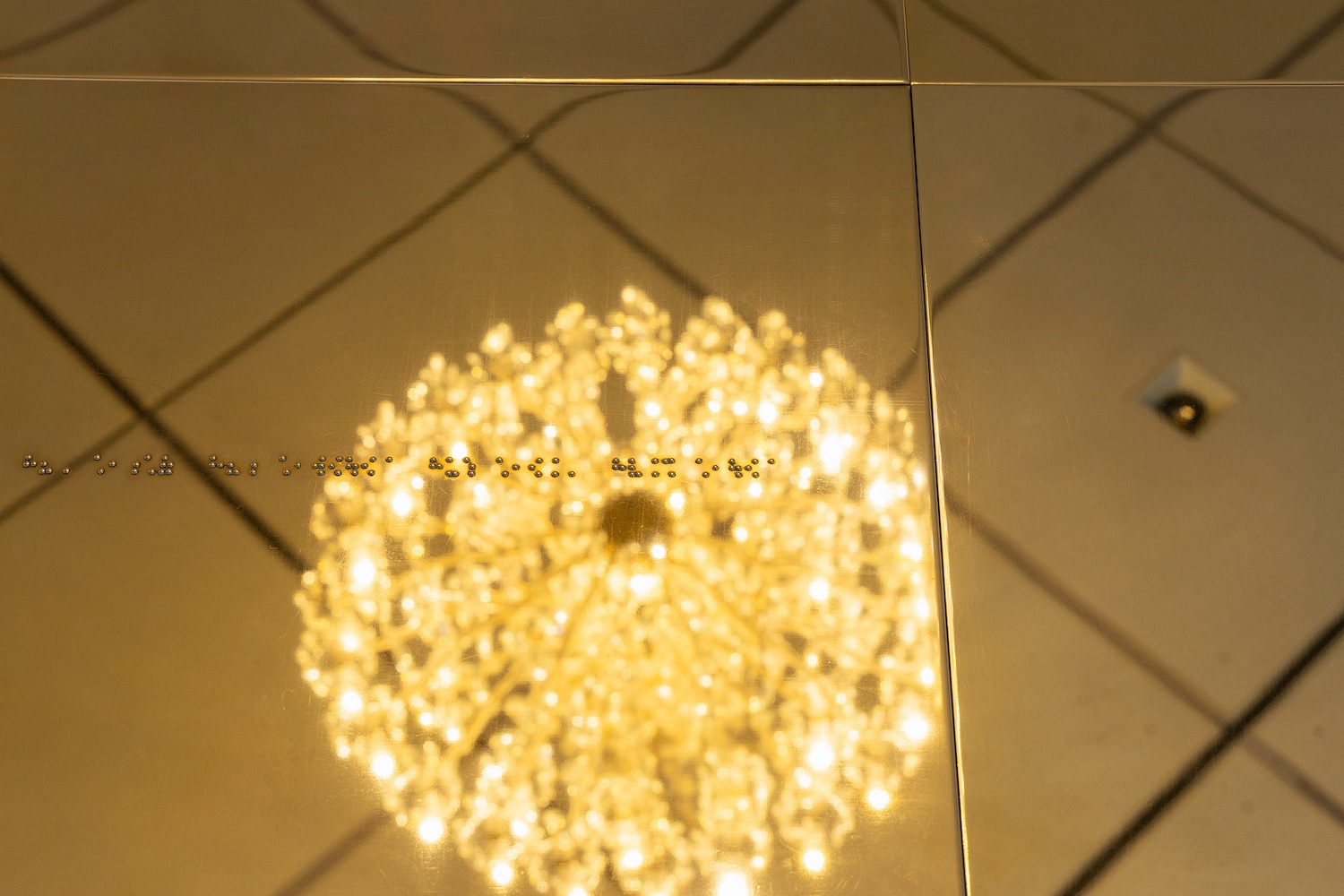 石原の《世界。》は、床に正方形に敷き詰められた真鍮板を、まばゆいシャンデリアが照らし出すインスタレーションである。真鍮板の表面には点字で短文が刻印され、鑑賞者は靴を脱いでその上を歩くことで、足裏で点字の凹凸を感じることができる。だが、点字を読めない者はその意味を解読できず、シャンデリアのまばゆい光の下、「見る者」が「見られる対象」に反転される。
