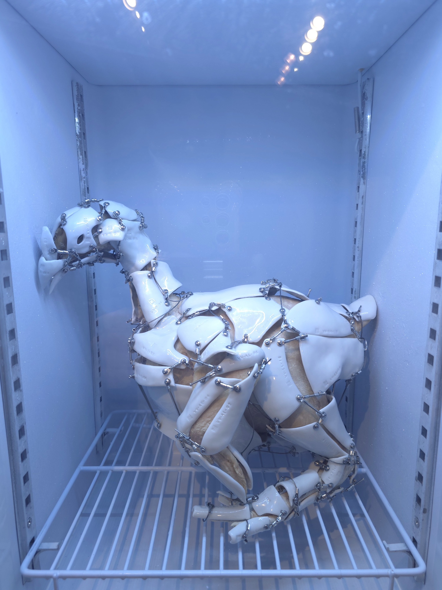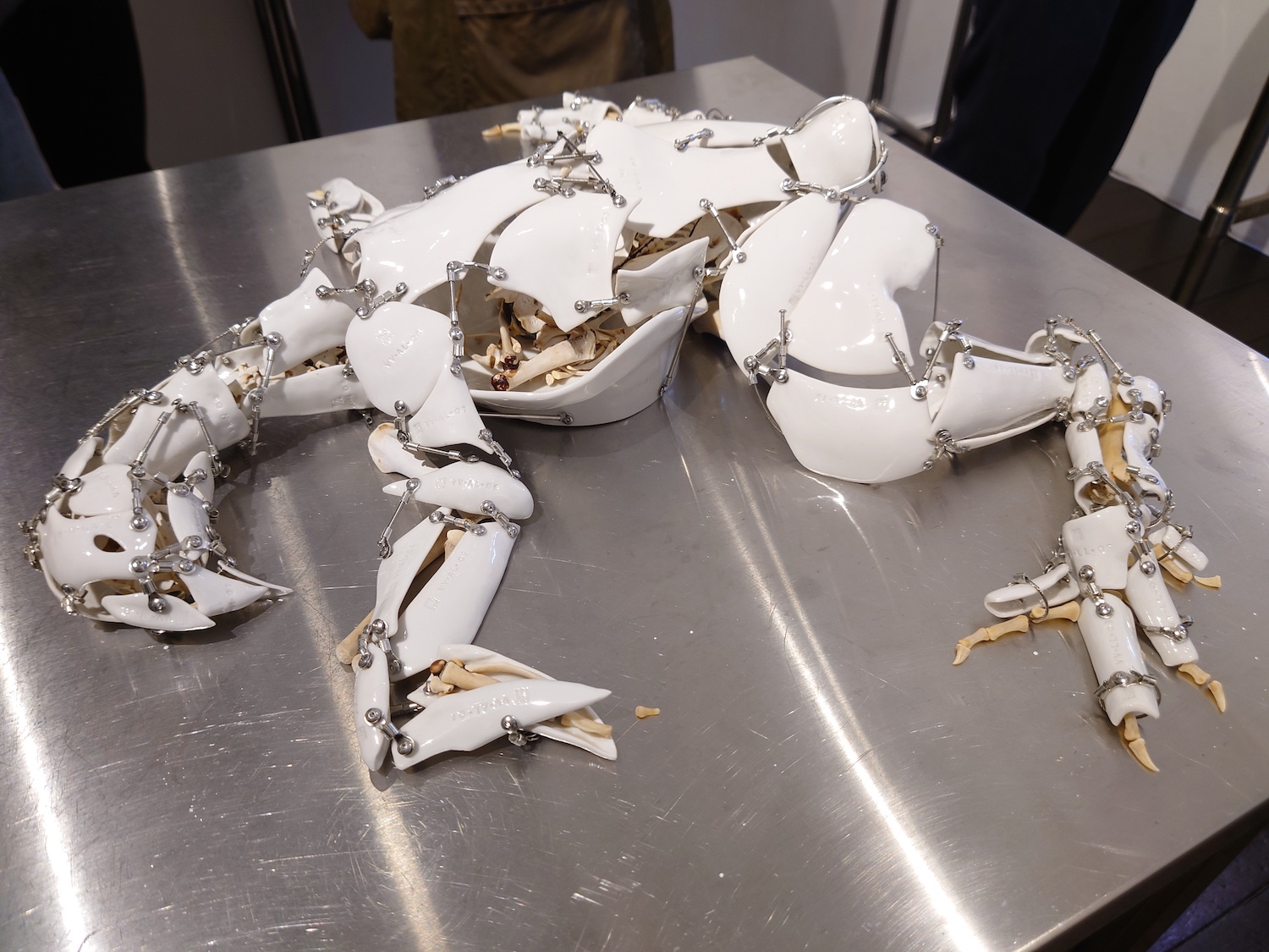 食後に残った骨で鶏の全身を復元したものは、解剖を思わせる体勢で無機質なステンレスの台に載せられ、解剖学の実験台/キッチン台という両義性を示す。よく見ると、下側の腹を覆うパーツに 高台 (皿や茶碗の底に付けられる台)が備えられ、これが「皿」であることを示す。また、磁器片の一つひとつには、高級磁器のマイセンのように刻印が押され、個別性と量産性を強調する(各部位ごとに、「鶏」の漢字をロゴマーク風にデザインした刻印とともに、アルファベットと数字が刻印されている。例えば「VV-AR-01」という刻印では、VVは作品名「Vitality Vessel」、ARは「ARM RIGHT」を示し、「01」は配置順の通し番号を示す)。《Vitality Vessel》は、食材が供される「皿」「器」であると同時に、「食べられること」を拒絶するプロテクターでもある。それは、「食べる行為における野蛮さの忘却」という矛盾を本質的に内包する器を、別の矛盾する命題へと書き替える。