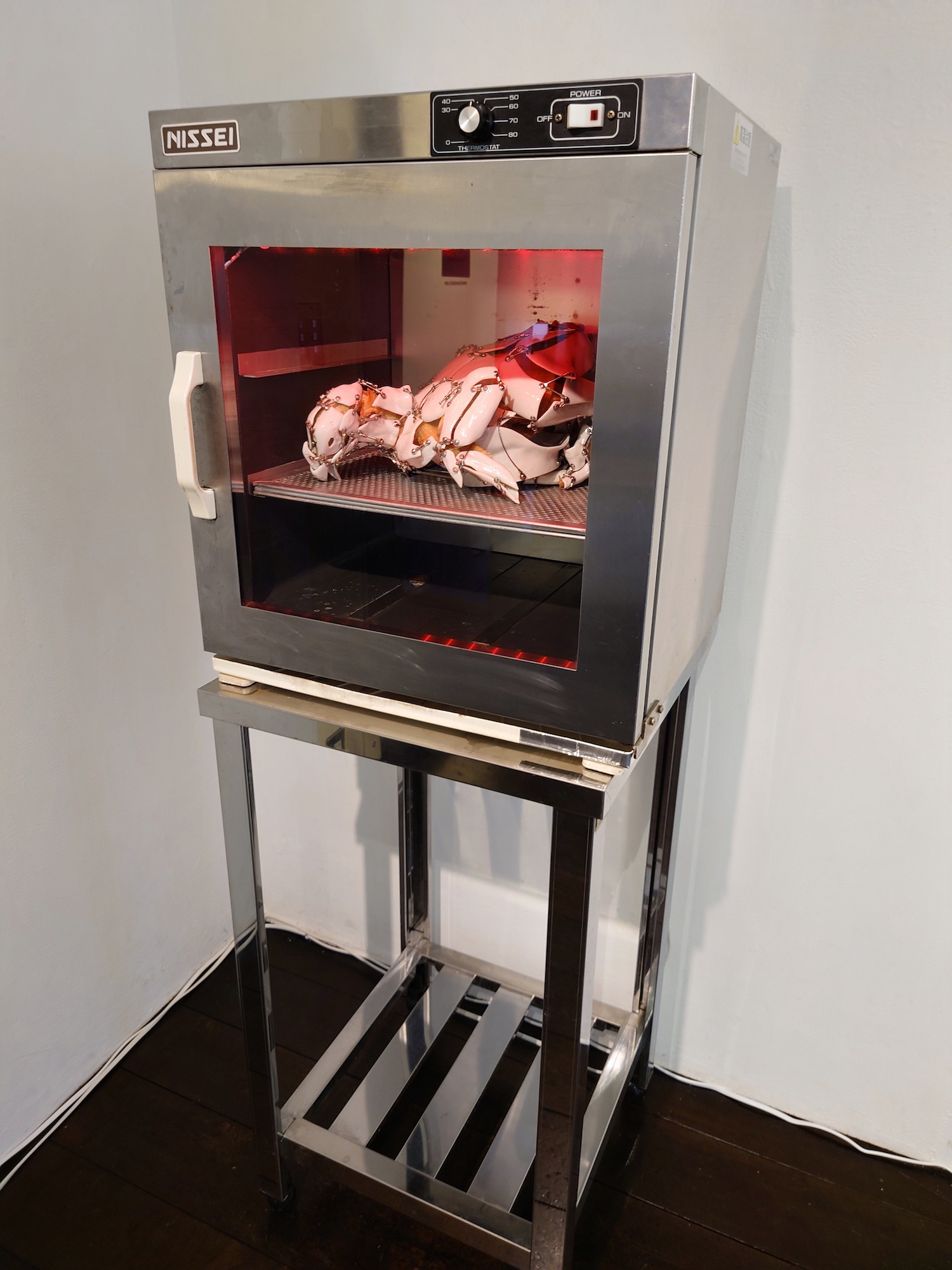 陶芸作家の藤井毅は、こうした「野蛮さを忘却・隠蔽するための装置」としての器の根源に着目し、器を「生と死を媒介するメディア」として捉える。《Vitality Vessel》は、羽をむしられた鶏の全身を型どりし、頭部、首、胴体、両手足をパーツ毎に磁器片で形成し、可動部をボルトとワイヤーでつなげて、プロテクターのように鶏の全身を覆った作品である。保存中/食前/食後の状態に対応した3つのタイプが作られ、磁器片をつなげてプロテクターのように全身を覆われた鶏を冷凍庫で保存中の状態、保温庫で温めている食前の状態、そして食べ終わった後の骨で復元した全身像を磁器片で覆ったものが展示された。