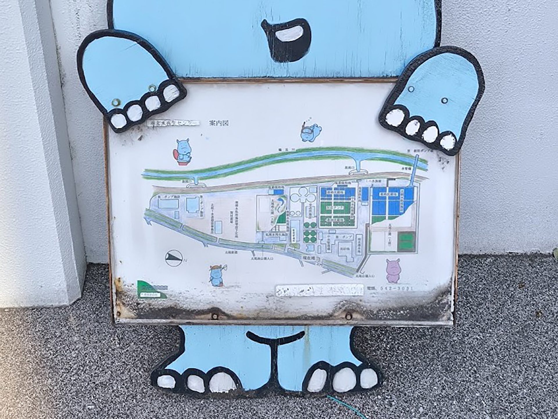 港北水再生センターの敷地に設置された平面図。下水処理の工程は川へ徐々に近づくように、浄化槽から浄化槽を次々と通過していく[筆者撮影]