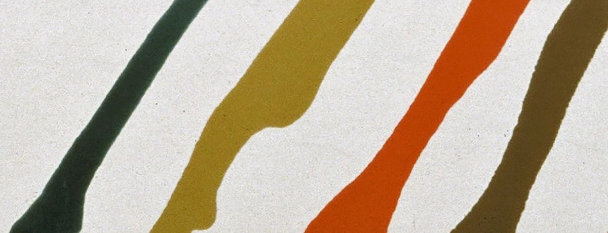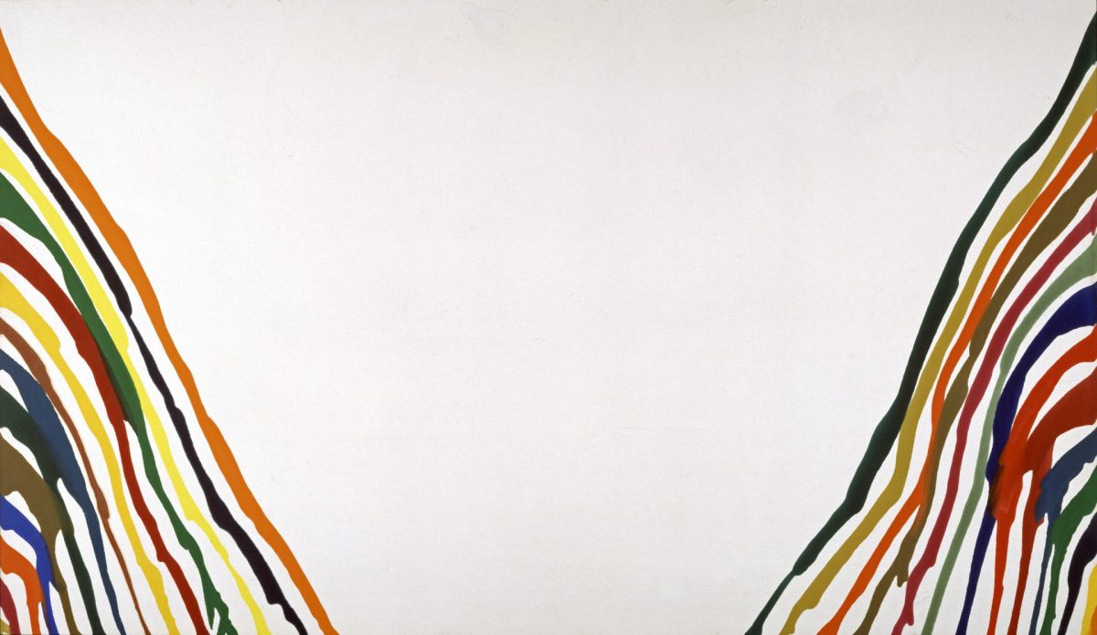 大きな画面の左右両端から中央下部へ向けて、緩やかに細くなりながら絵具が列をなして流れ込み、中央には大きな空白がある構図。