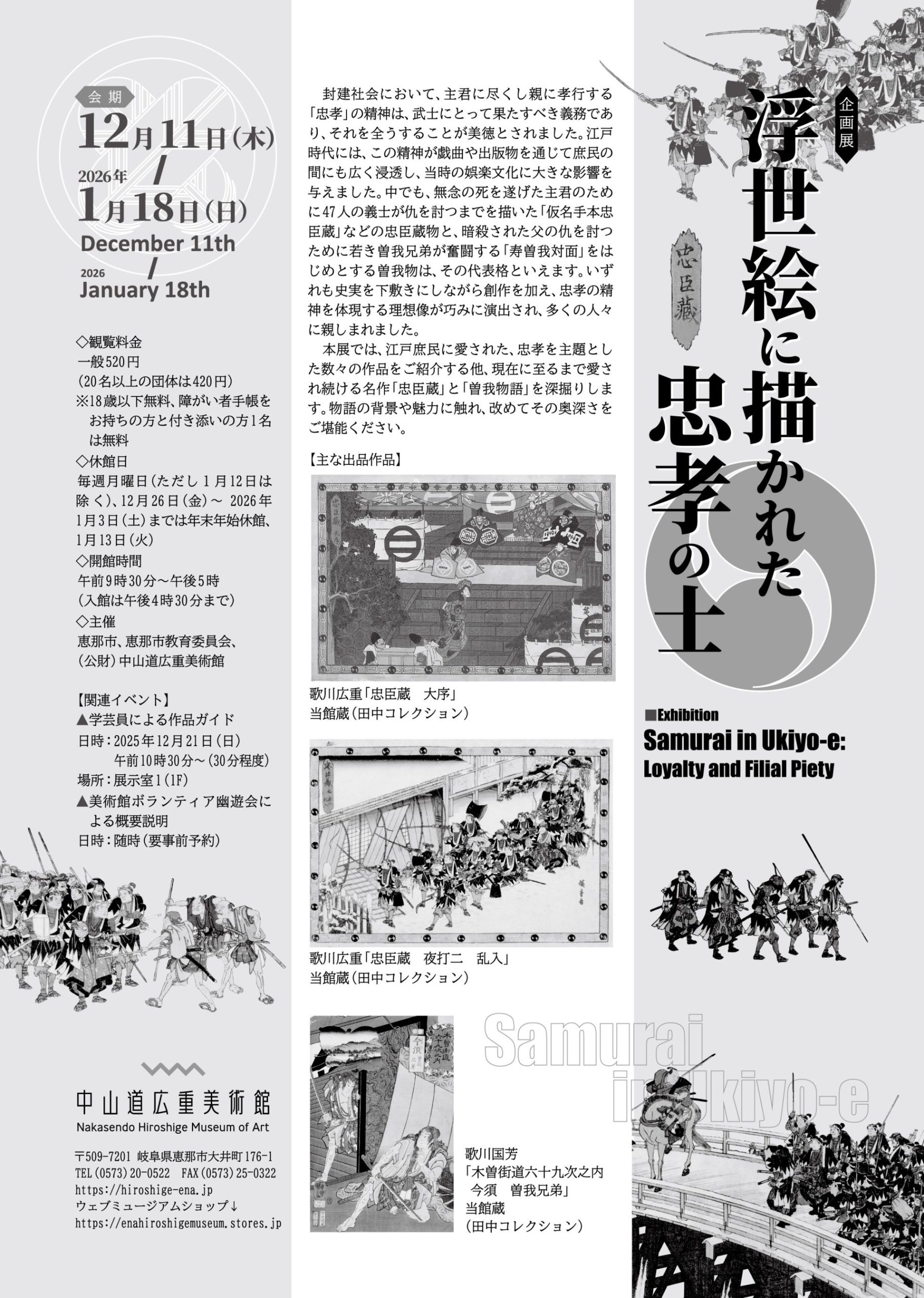 本展では、江戸時代に主君や親に義を尽くす人物を題材にした戯曲として庶民の心を強くとらえた「忠臣蔵」や「曽我物語」などを主題とした浮世絵をご覧いただきます。
