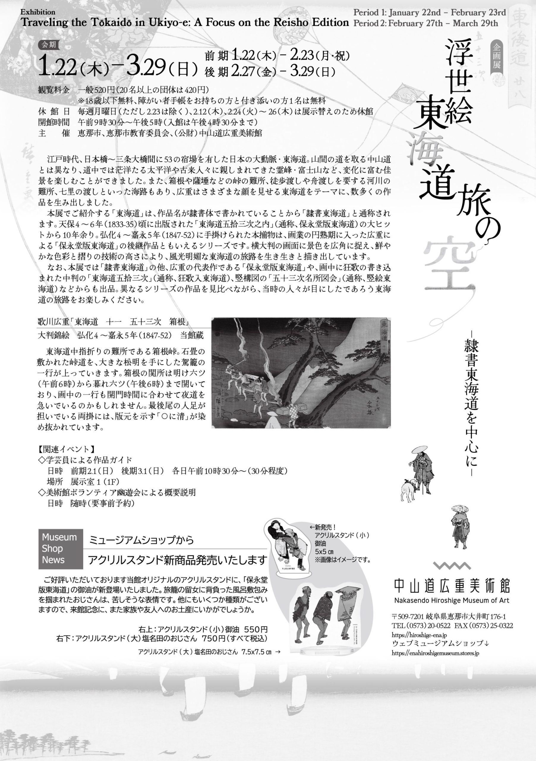 本展では「隷書東海道」全55図のみならず、他の東海道揃物からも出品。皆さまを江戸時代の旅の空へとご案内します。