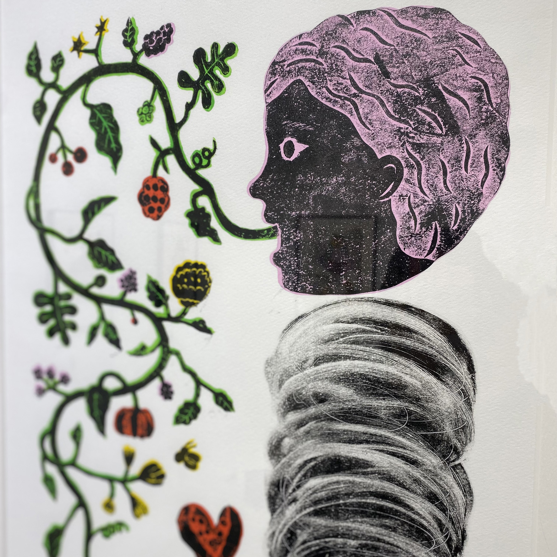 神話やアニミズムをベースとして制作される数多の作品は、軽快でありながら力強さを感じさせます。本展覧会で展示される“圧痕版画”と作家に名付けられた12メートルの作品は、指とスタンプ台を使った独自の方法論によって制作されています。これらユニークな作品は、即興性と実験的試みによって生み出され、漠とした根源的な要素を内包しつつある種のユーモアとエンターテイメント性を感じさせるものとなっています。是非この機会にご高覧頂ければ幸いです。