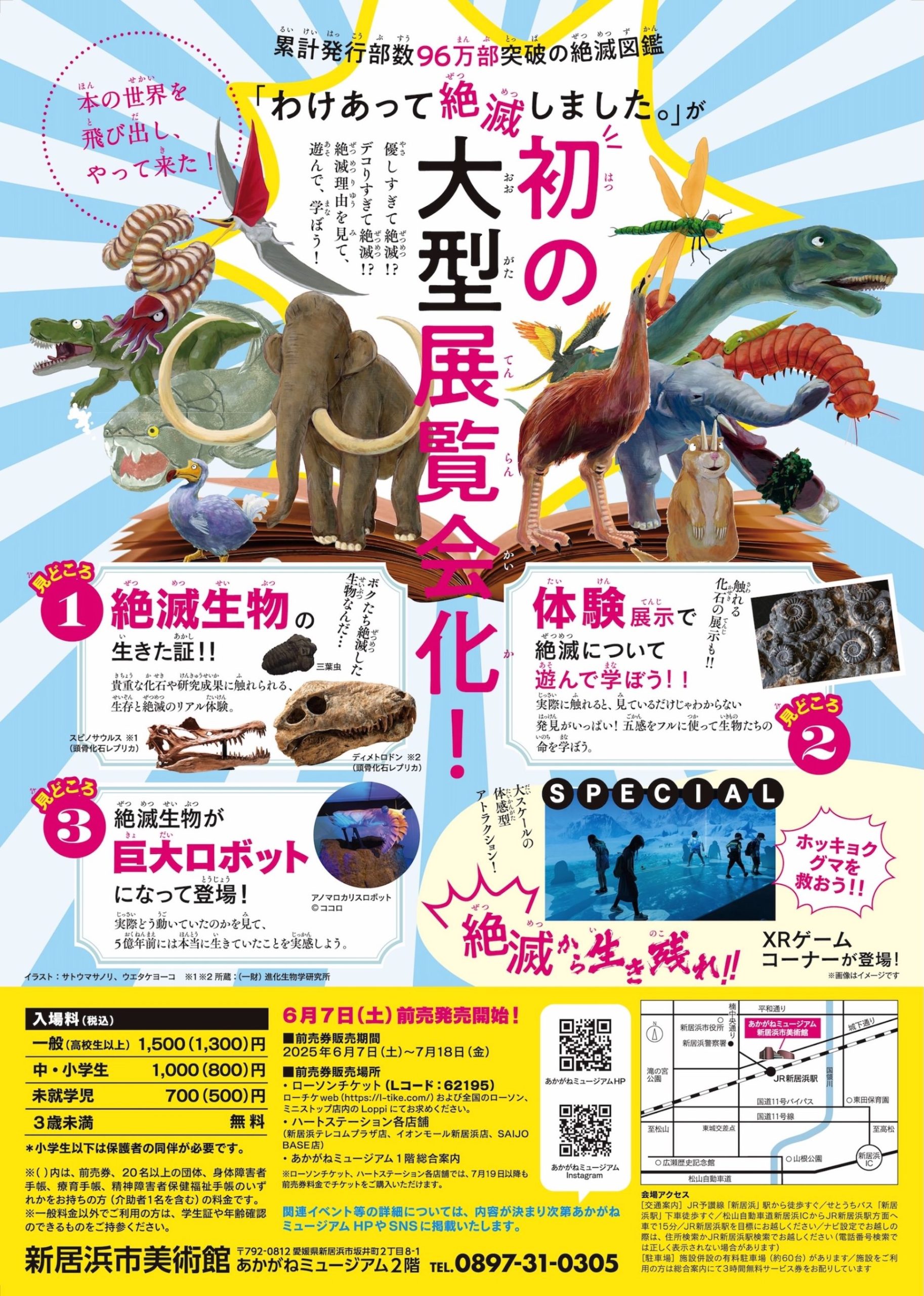 優しすぎて絶滅!? デコりすぎて絶滅!? まさかそんな理由で! と地球から消えていった生き物たち。絶滅はひどいことのように感じますが、大きな絶滅の後には必ず大きな進化を遂げる生き物がいます。絶滅した生き物の歴史を紐解けば、新たな絶滅を減らすヒントもきっと見つかるはず。大型標本やロボット、体感型アトラクションなど五感で楽しむ展示は、迫力満点! 絶滅した理由を、子どもはもちろん大人も学べる展覧会を、新居浜市美術館で開催します。