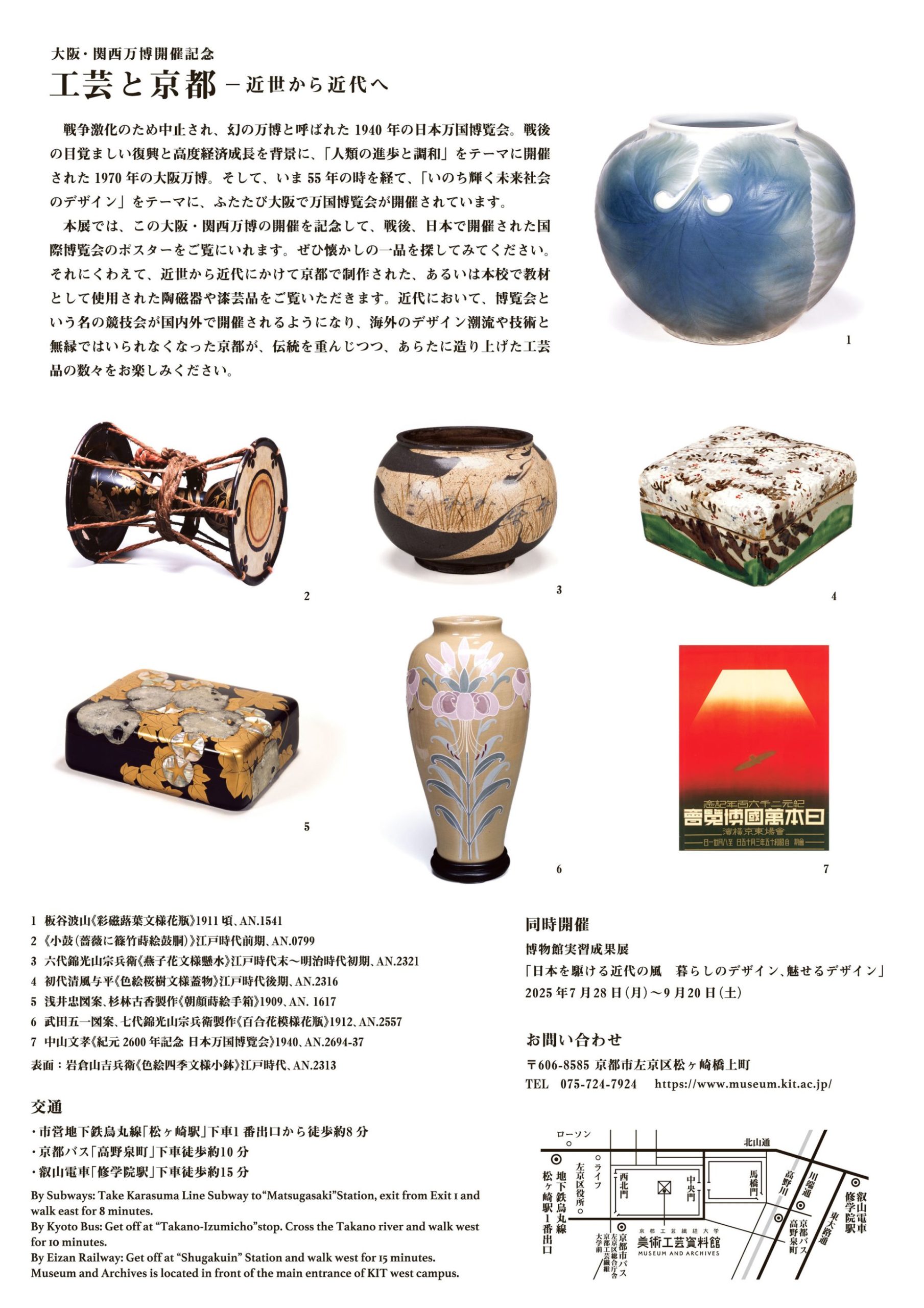 本展では、この大阪・関西万博の開催を記念して、戦後、日本で開催された国際博覧会のポスターをご覧にいれます。ぜひ懐かしの一品を探してみてください。それにくわえて、近世から近代にかけて京都で制作された、あるいは本校で教材として使用された陶磁器や漆芸品をご覧いただきます。近代において、博覧会という名の競技会が国内外で開催されるようになり、海外のデザイン潮流や技術と無縁ではいられなくなった京都が、伝統を重んじつつ、あらたに造り上げた工芸品の数々をお楽しみください。