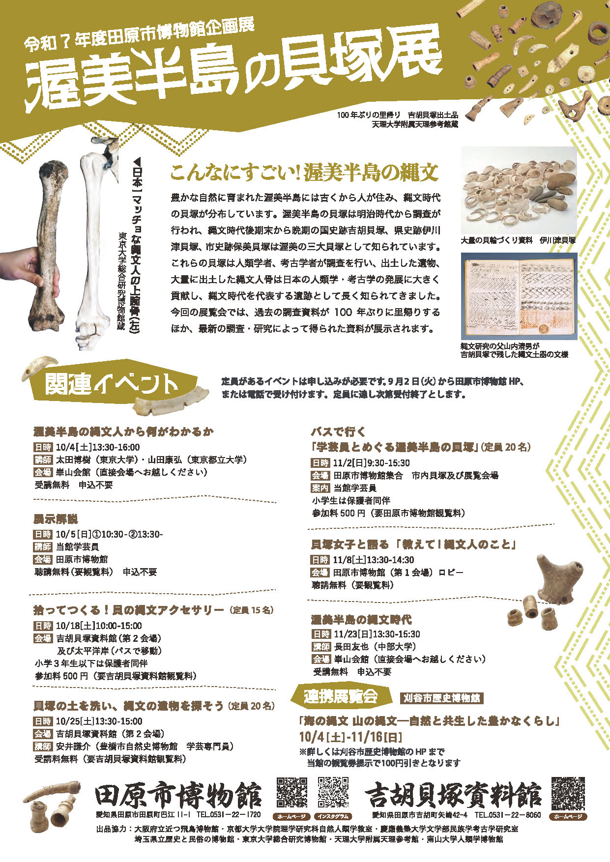 豊かな自然に育まれた渥美半島には古くから人が住み、縄文時代の貝塚が分布しています。渥美半島の貝塚は明治時代から調査が行われ、縄文時代後期末から晩期の国史跡吉胡貝塚、県史跡伊川津貝塚、市史跡保美貝塚は渥美半島の三大貝塚として知られています。これらの貝塚は人類学者、考古学者が調査を行い、出土した遺物、大量に出土した縄文人骨は日本の人類学・考古学の発展に大きく貢献し、縄文時代を代表する遺跡として長く知られてきました。