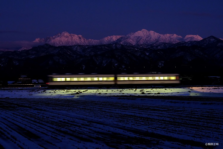 残照の立山連峰と富山地方鉄道 🄫相原正明
