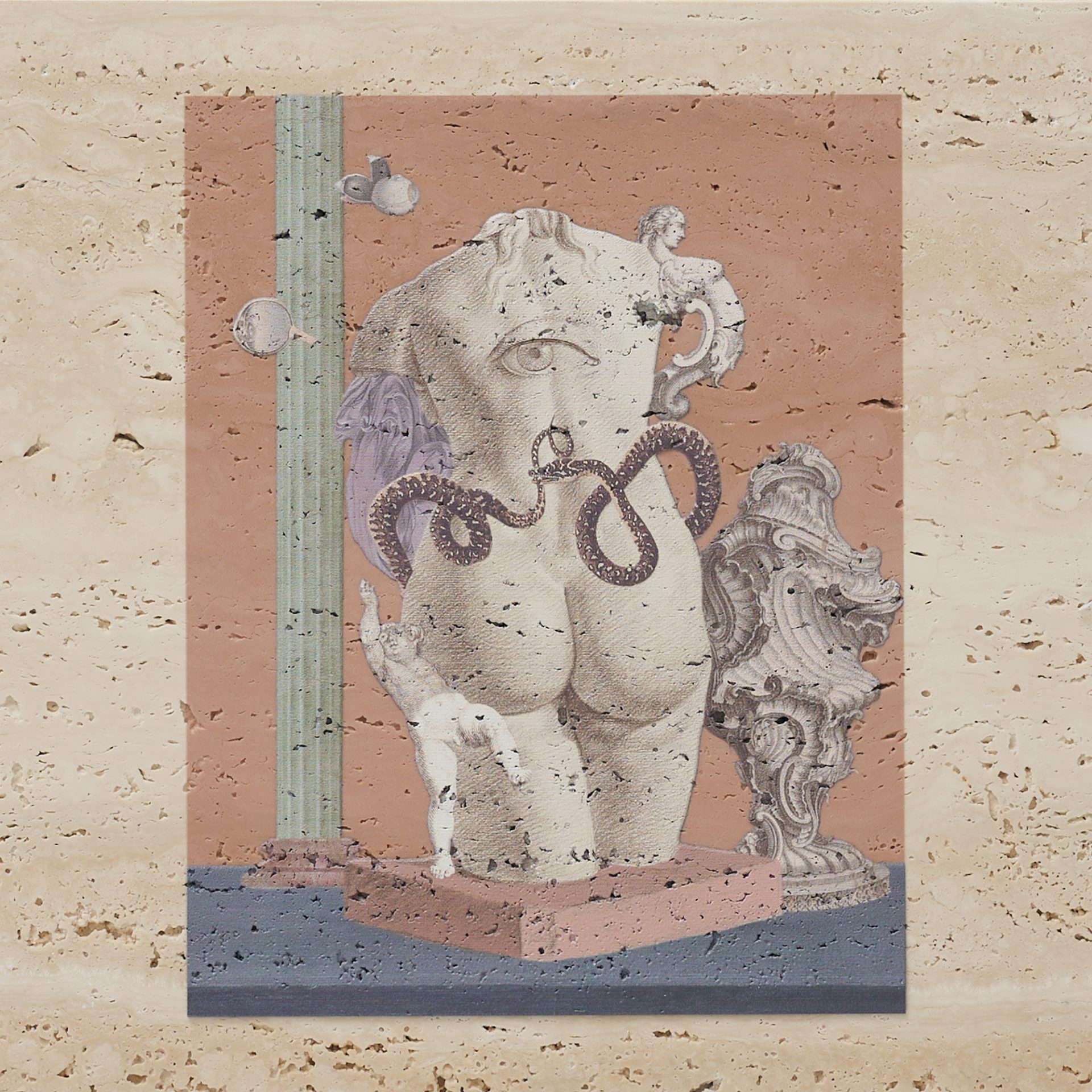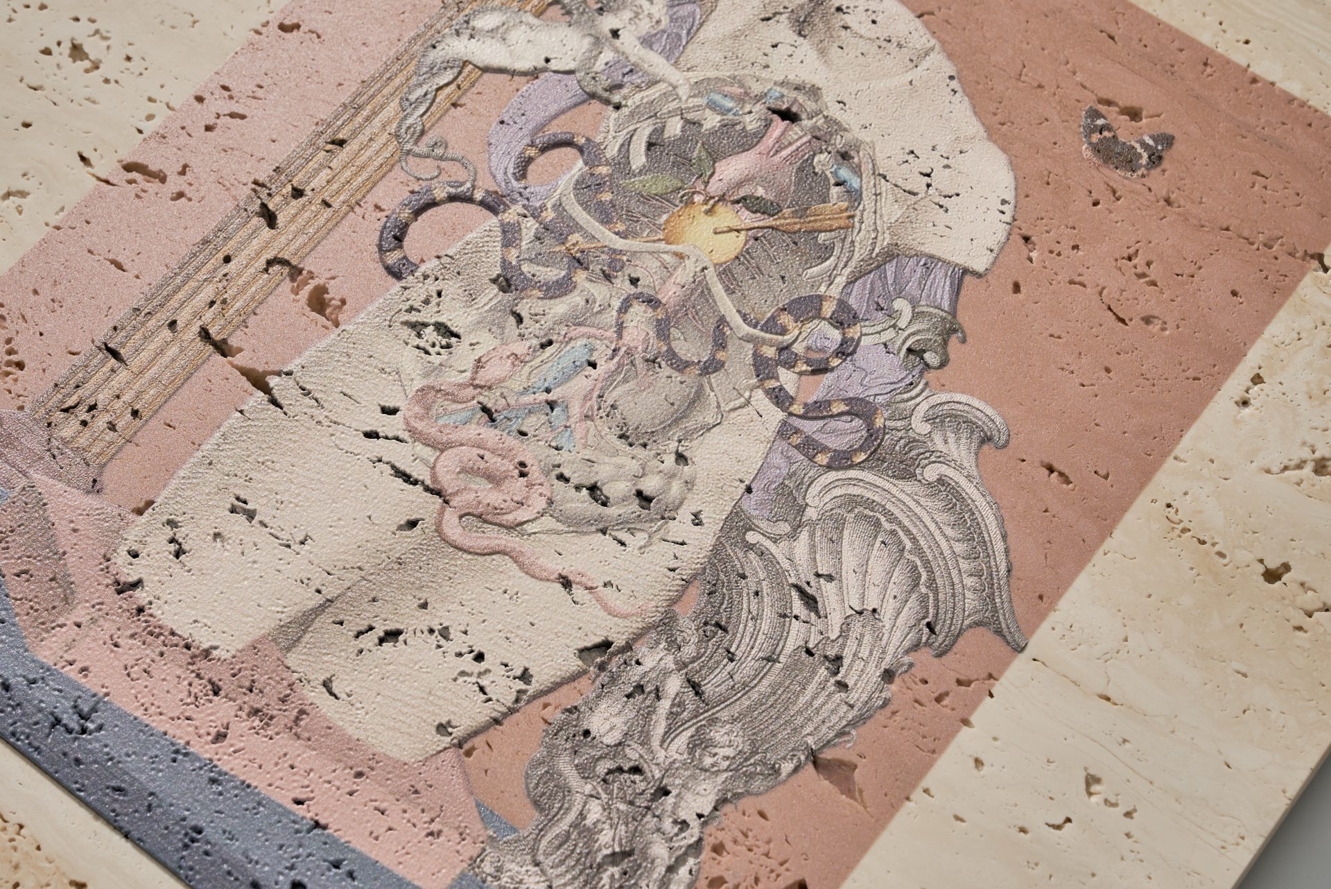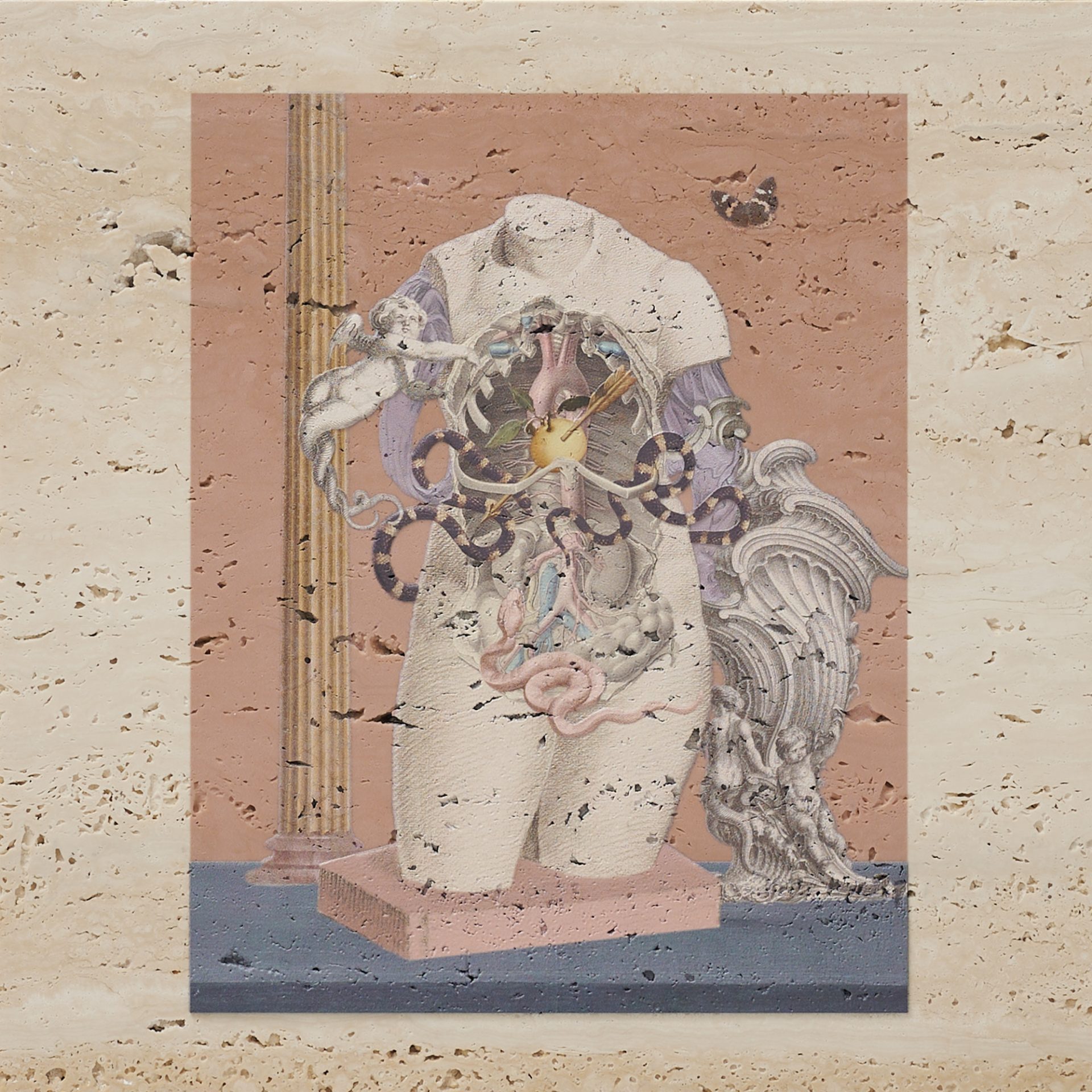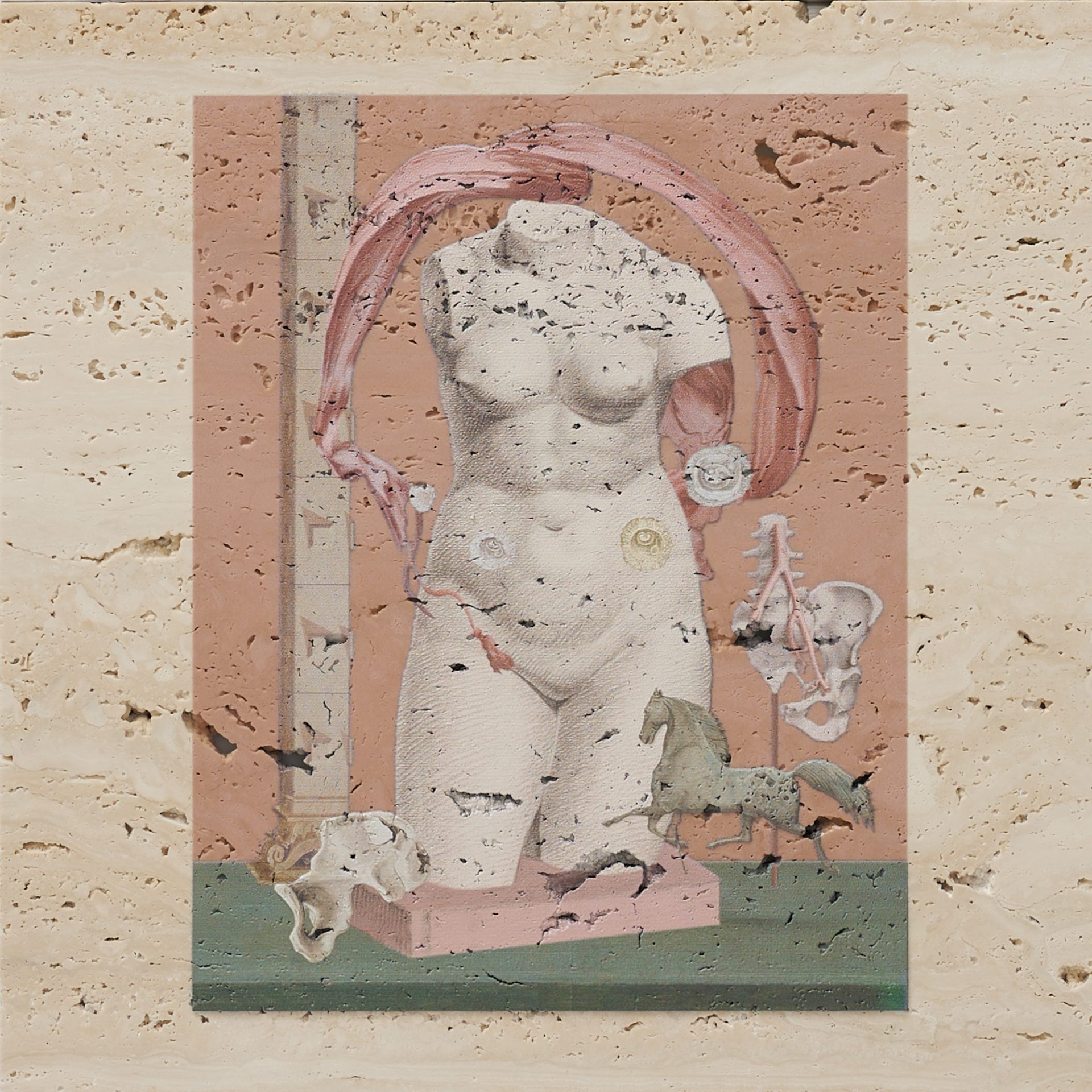「名画の中の⼈体はどうなっているのだろう︖」という解剖学的な好奇⼼のもと、内臓や⾻をモチーフに描かれるモンタージュは、古典芸術への敬意を前提としながら、「芸術のための芸術」と誠実に向き合う試みをしています。
