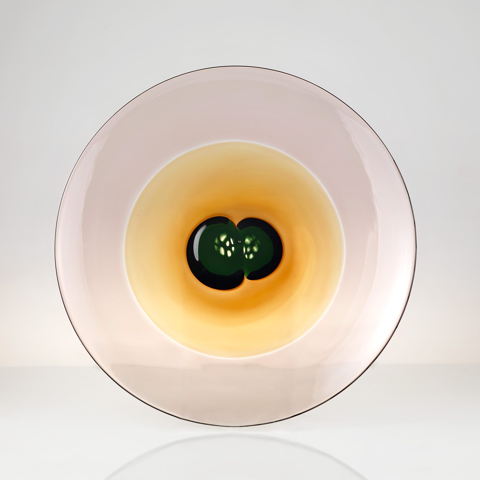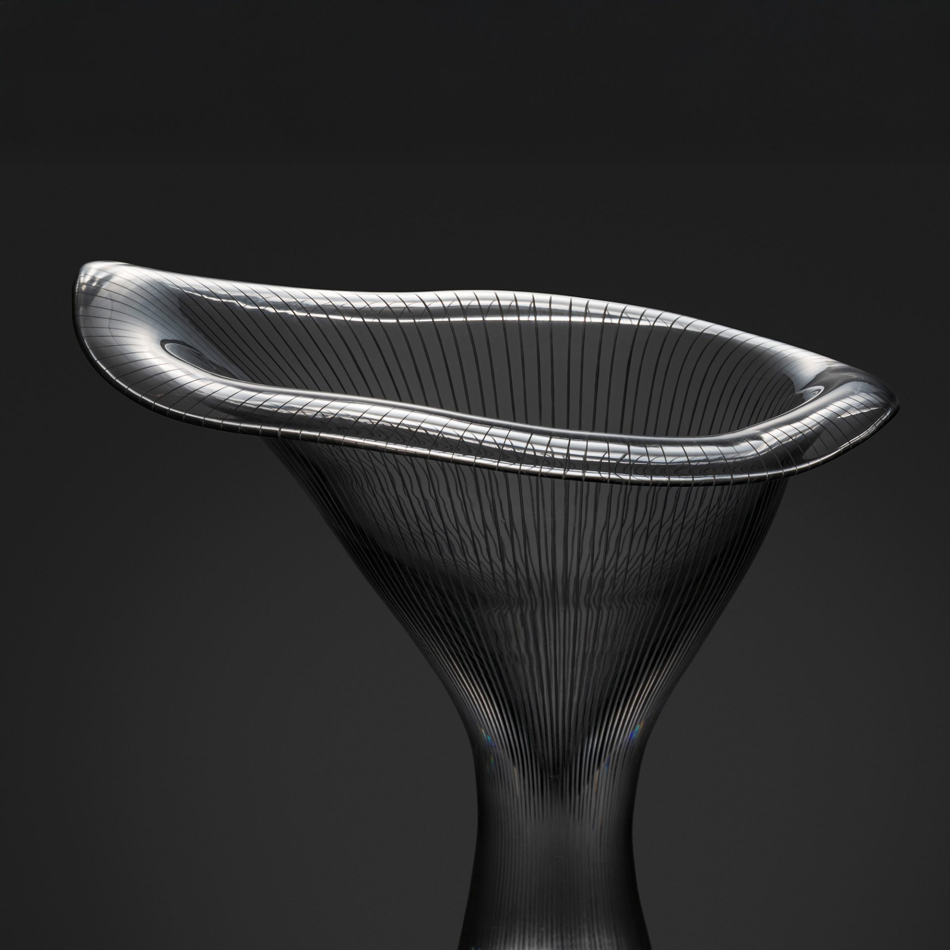 1946年、ガラス製造会社イッタラのデザインコンペ優勝を機にヴィルカラは同社のデザイナーに起用され、約40年にわたり第一線で活躍しました。セラミック・アーティストの妻ルート・ブリュック同様、ラップランドの静寂をこよなく愛し、生命の神秘や大自然の躍動を着想源に、「ウルティマ・ツーレ」(ラテン語で「世界の最北」を表す言葉)をはじめとするガラスの名作を誕生させました。デザインの対象はガラスのほかに磁器、銀食器、宝飾品、照明、家具、紙幣、グラフィック、空間まで広くおよび、あらゆる素材に向き合い、触覚と視覚を鋭く働かせて生みだす洗練されたフォルムがヴィルカラの作品の見どころです。