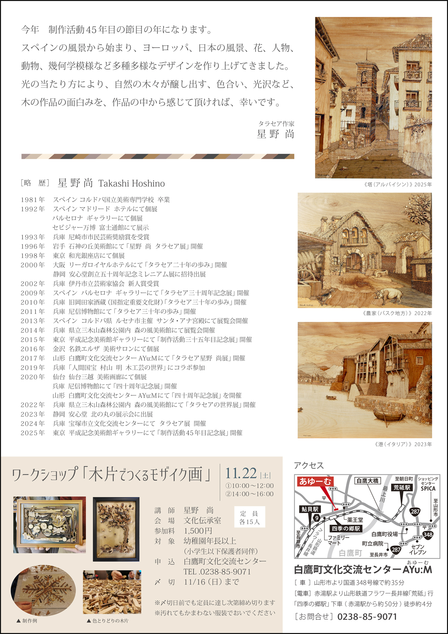 ※ご参加いただいたかたは、展覧会「タラセア・木の絵画 星野尚45年のあゆみ」当日限り観覧可