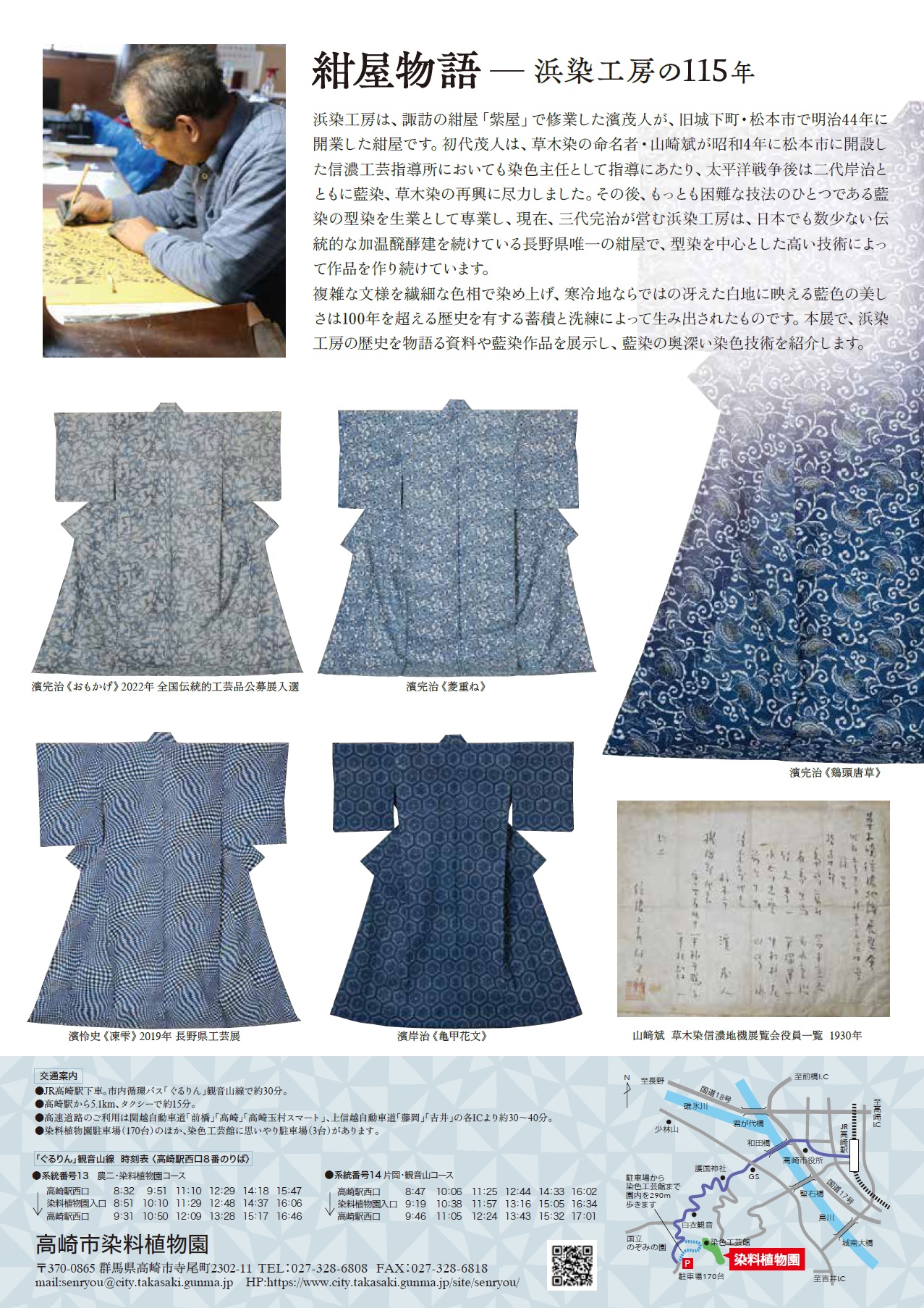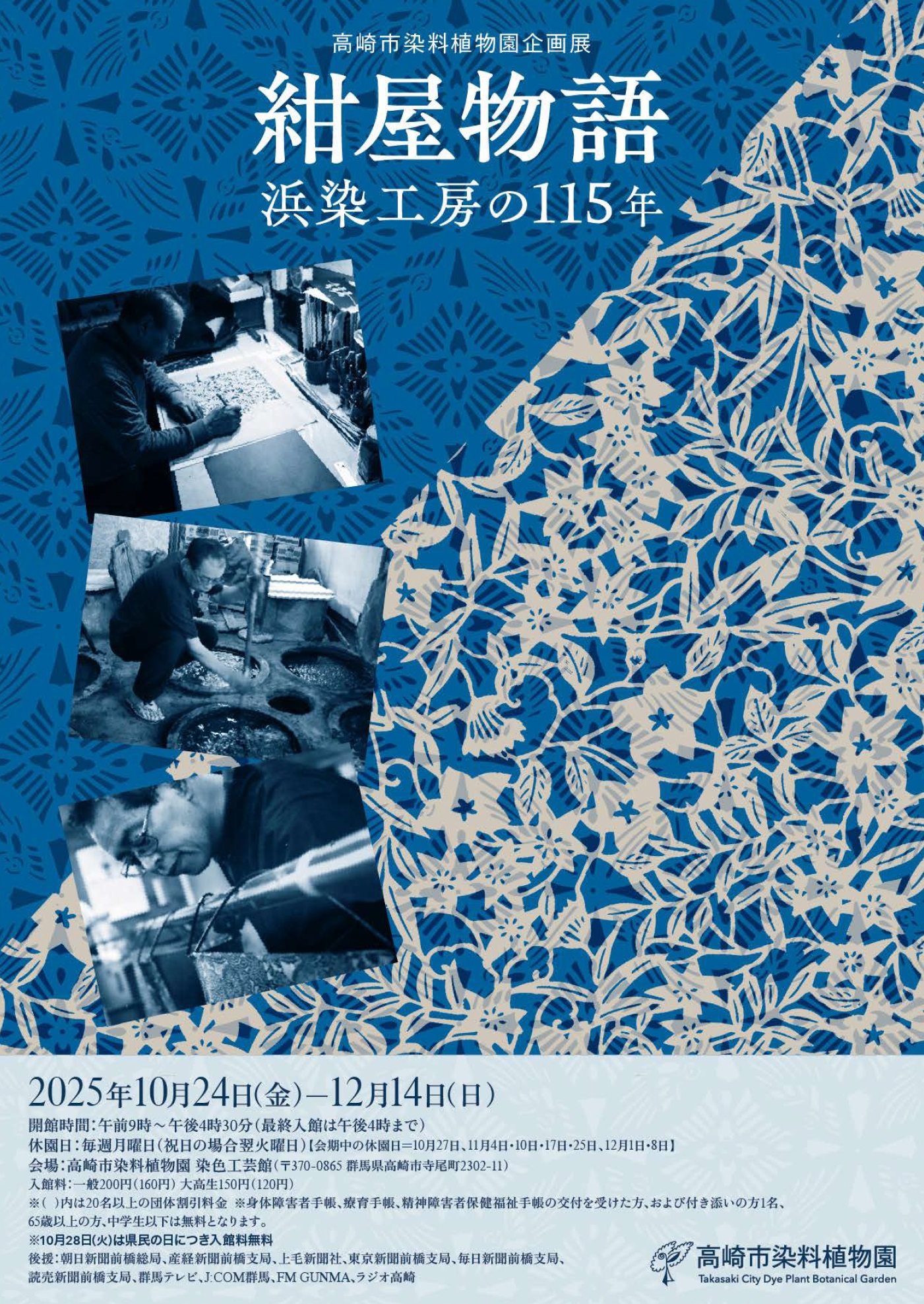 複雑な文様を繊細な色相で染め上げ、寒冷地ならではの冴えた白地に映える藍色の美しさは100年を超える歴史を有する蓄積と洗練によって生み出されたものです。本展では、浜染工房の歴史を物語る資料や藍染作品を展示し、藍染の奥深い染色技術を紹介します。