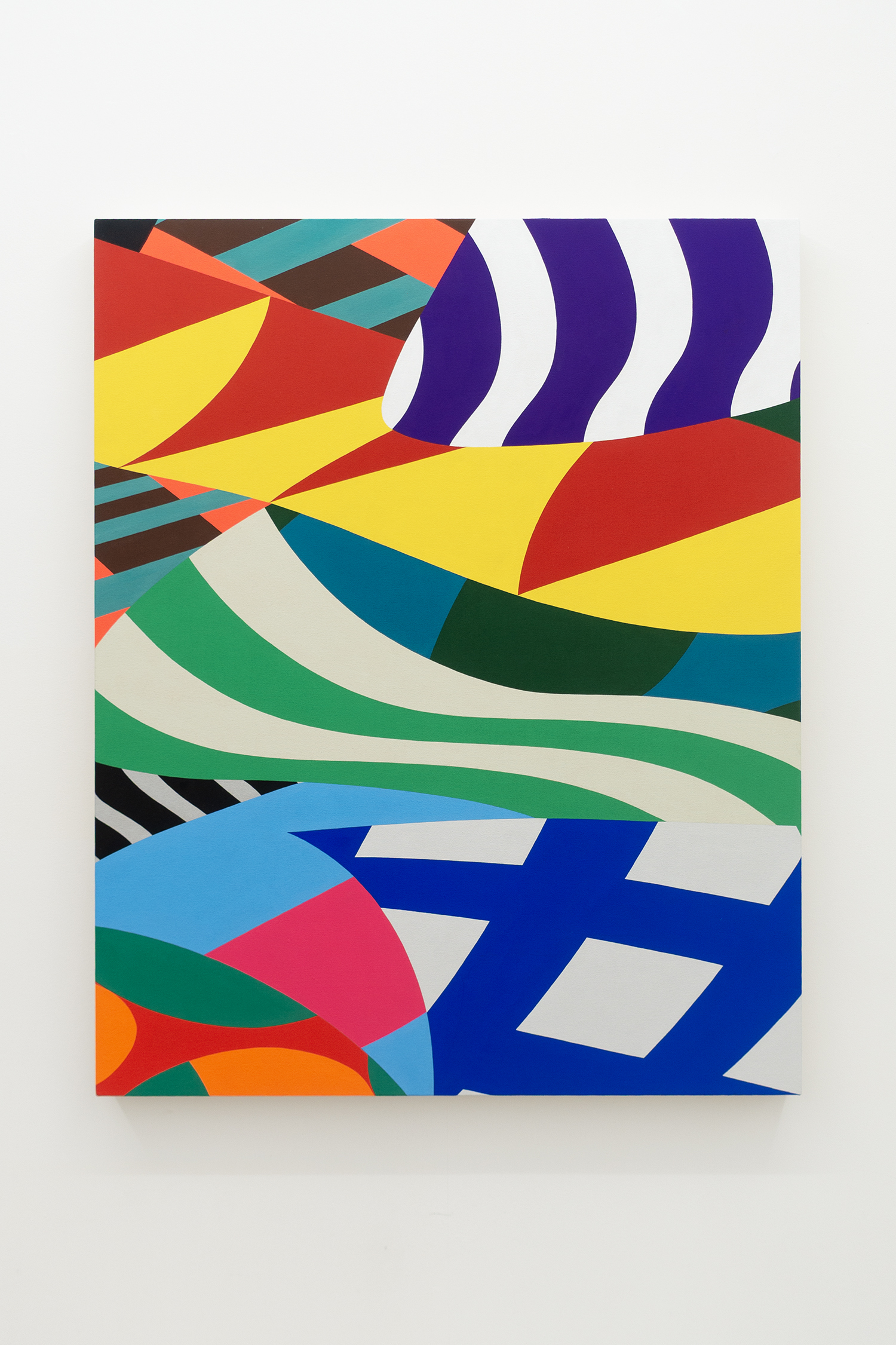 風に揺れる旗を思わせるストライプは、カモフラージュや国旗のようにも見え、観る人にさまざまなイメージを想起させます。色彩の重なりからは奥行きや層の錯覚が生まれ、地と図、イメージと物質といった相反する要素を軽やかに行き来する構造が浮かび上がります。