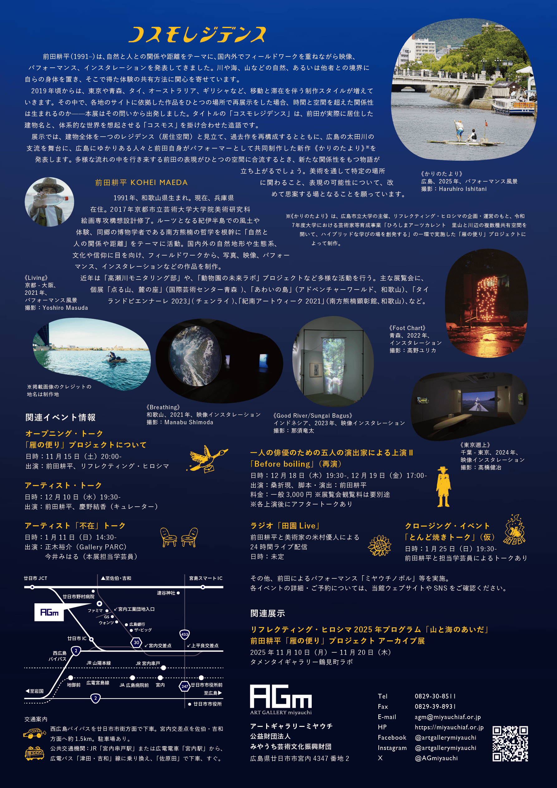 * 広島市立大学の主催、リフレクティング・ヒロシマの企画・運営のもと、令和7年度大学における芸術家等育成事業「ひろしまアーツカレント 里山と川辺の複数種共有空間を開いて、ハイブリッドな学びの場を創発する」の一環で実施した「雁の便り」プロジェクトによって制作。