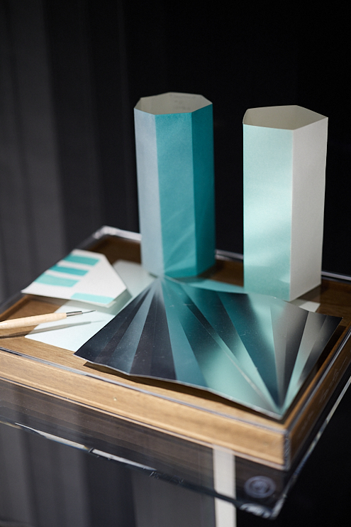 本プロジェクトでは、寒川氏の代表作の「Light and shadow inside me」シリーズから派生したモノクローム作品に着想を得ています。この作品群では、銀塩写真印画紙を多角柱状に折り曲げ、暗室で感光させるという独自のプロセスを用いて制作されています。光の角度や強度により生じる濃淡のグラデーションが紙上に形成され、その後、折り目を平らに戻すことで、写真とも絵画とも言い難い不思議な存在感を持つ作品が完成します。