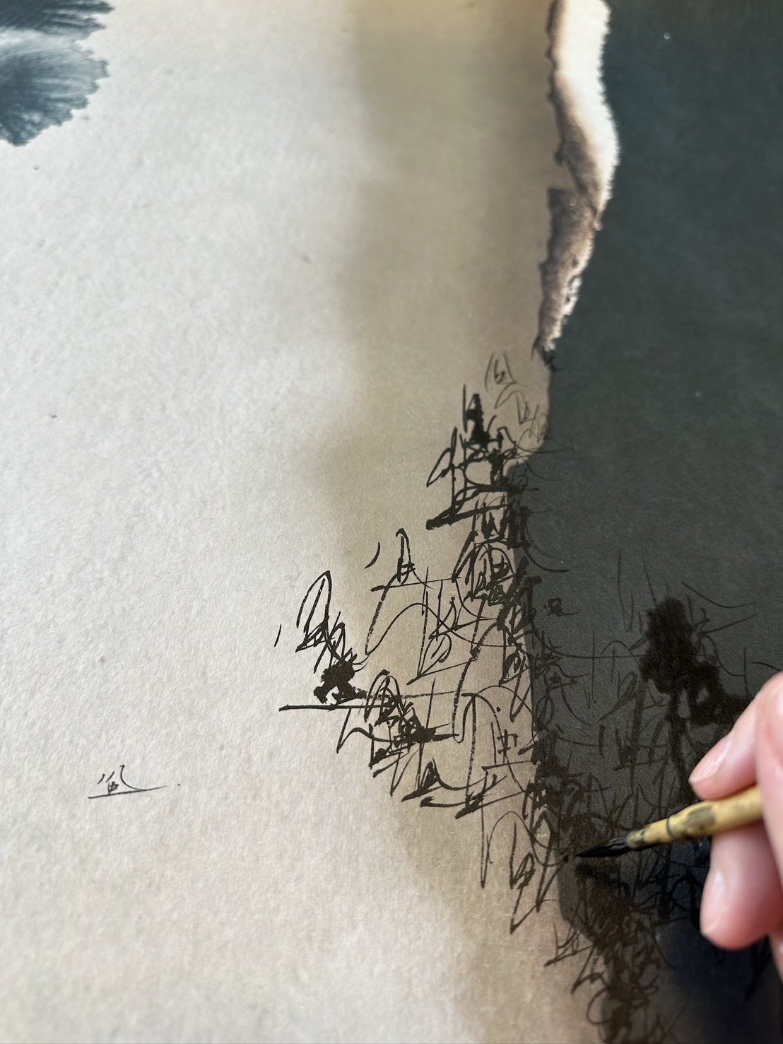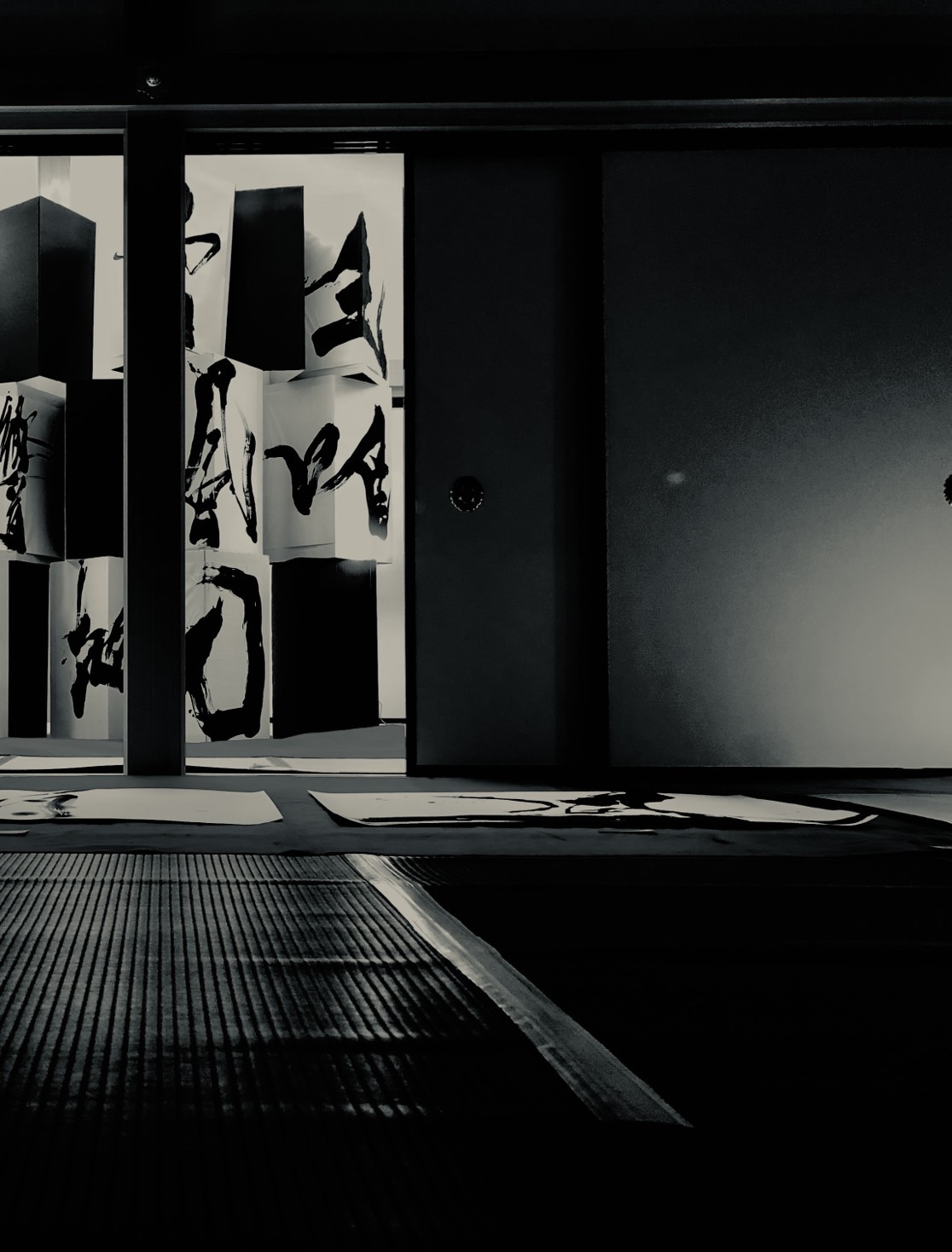 “Liminal” は「境界」や「遷移的な」という意味で、「閾」と同じく、ある場所から別の場所への移行の空間を指します。墨が滲んでゆく先には、線と線との間にうまれたLiminalな間があり、それは、何かが「終わった」わけでも「始まった」わけでもない、静かで不安定で、けれど強いエネルギーをはらんだ「あわい(間)」。我々の愚かな過ちを見透かしているかのような、目には何も映らない、白。