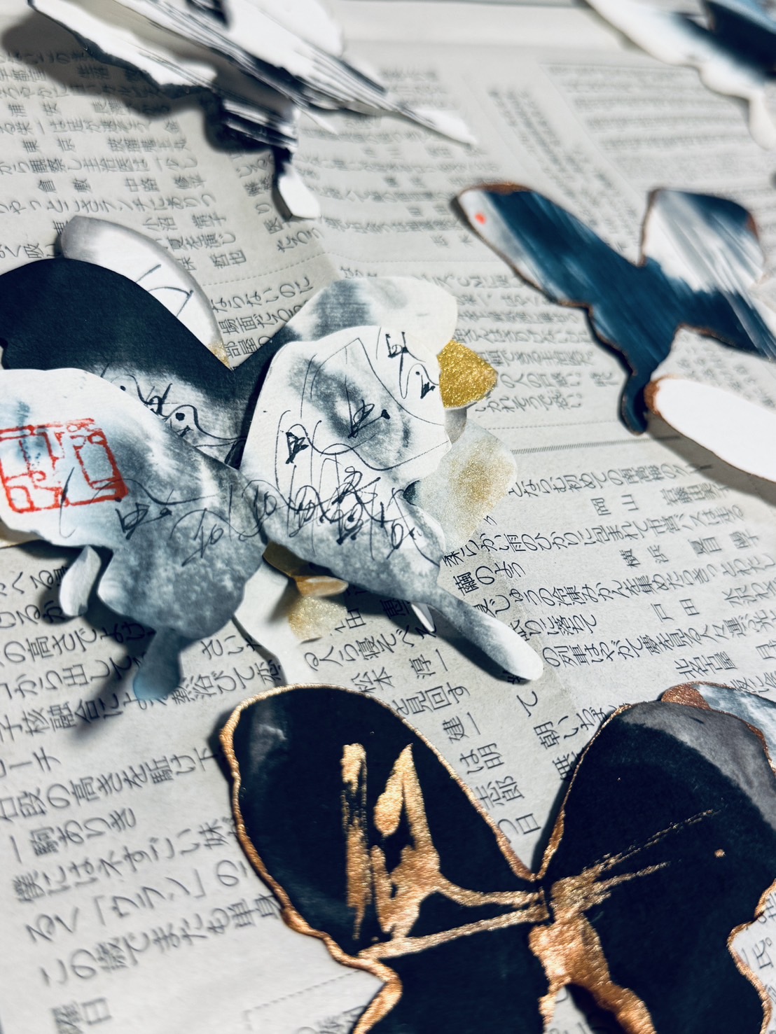 蝶々の形の和紙(専門家用手漉きの良い書道紙です)に筆ペンで文字を書いて、作品にとまらせる・という簡単で楽しめる企画。無料で誰でも参加可能、5分で完成します!
